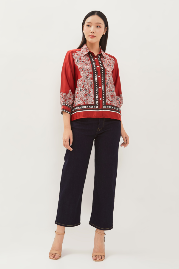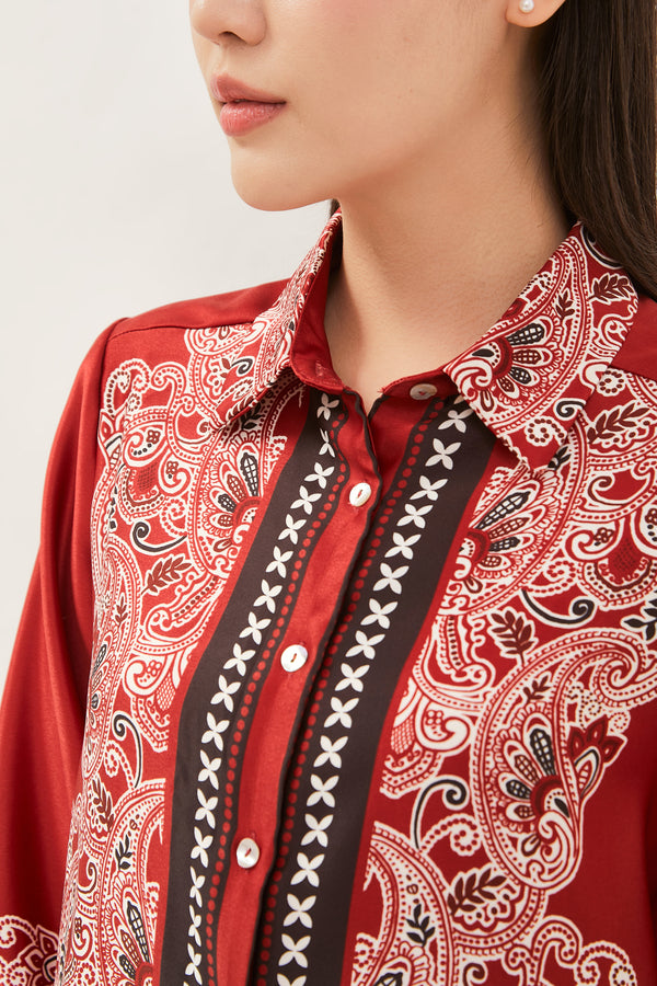 Blus lengan balon berbahan satin dengan detail print motif paisley kawung.