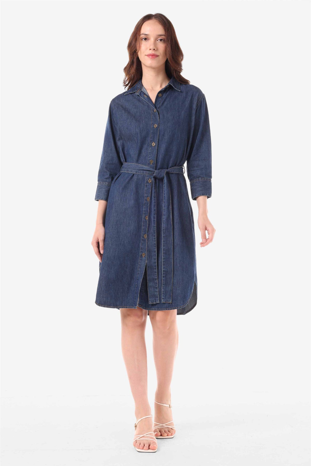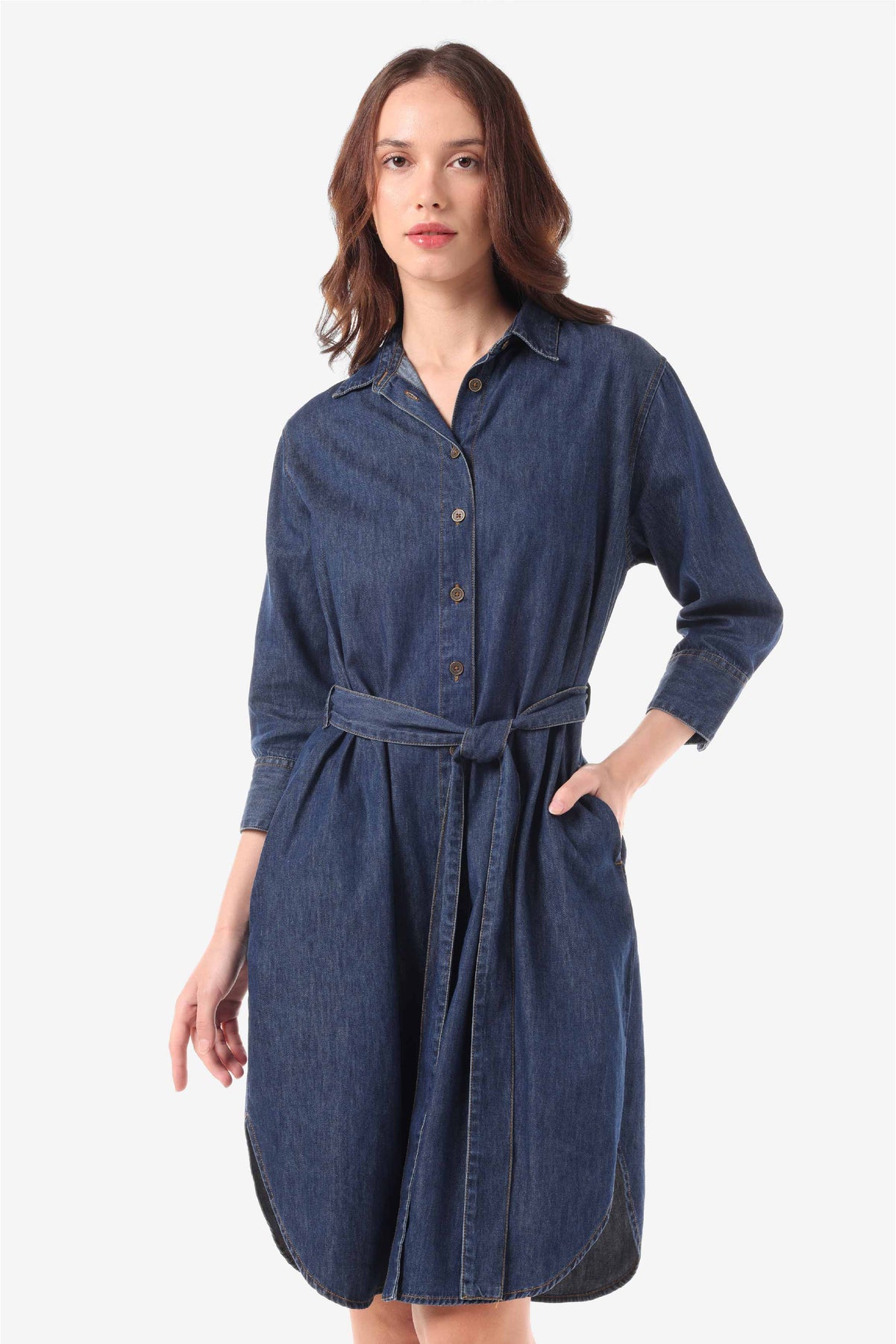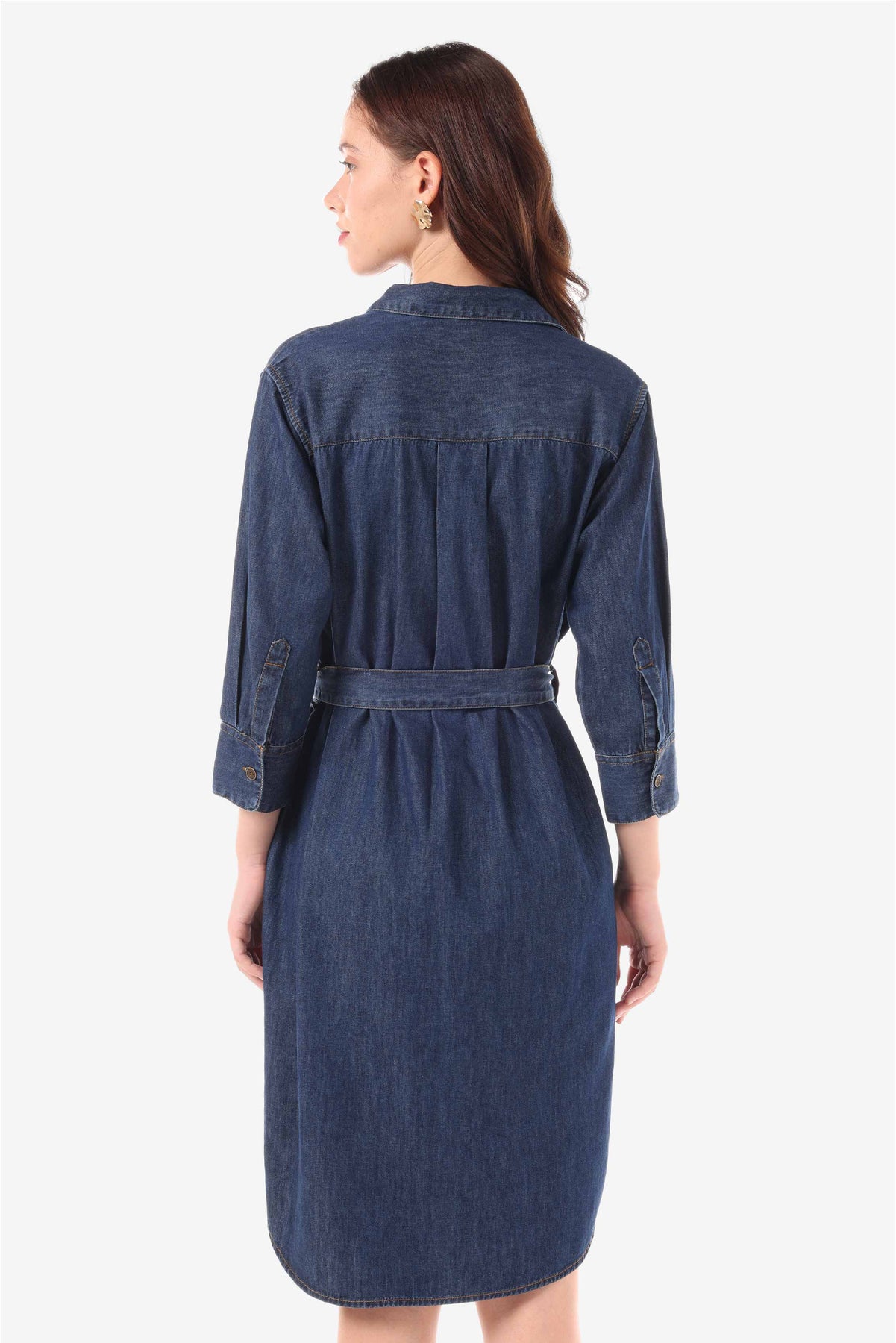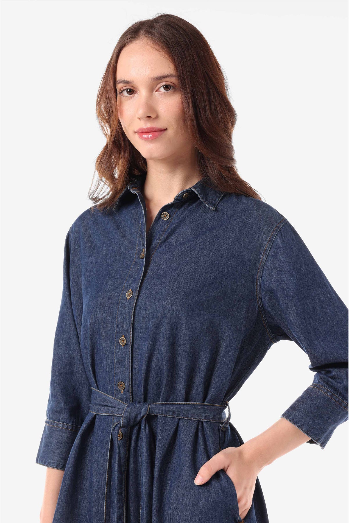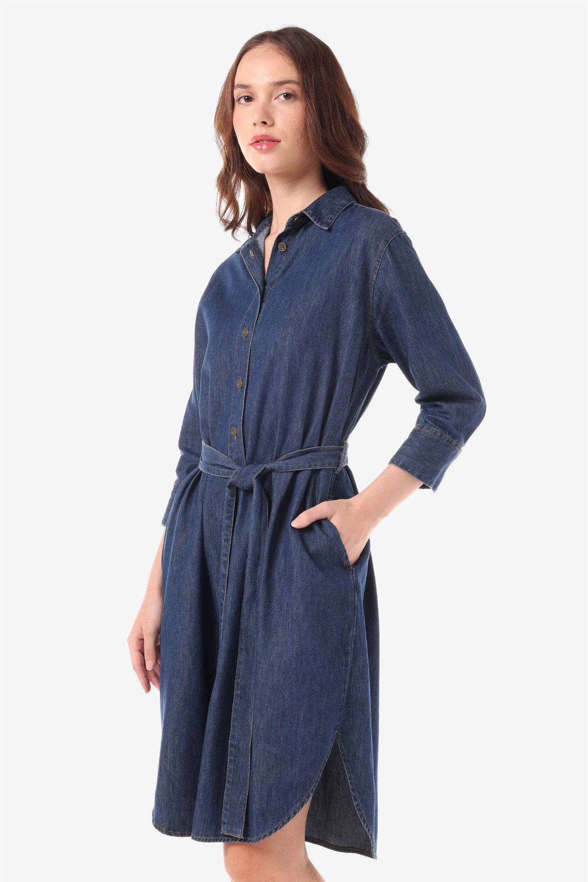 Denim shirt dress dengan detail kantong pada kedua sisi side seam