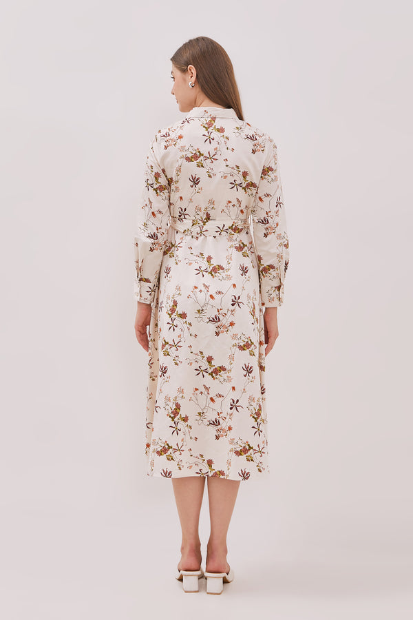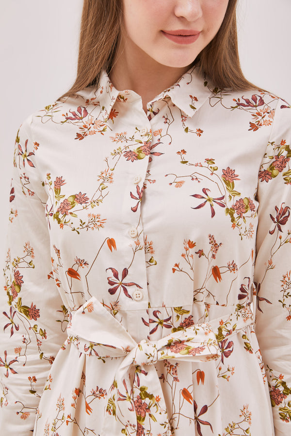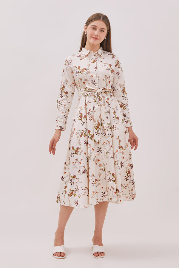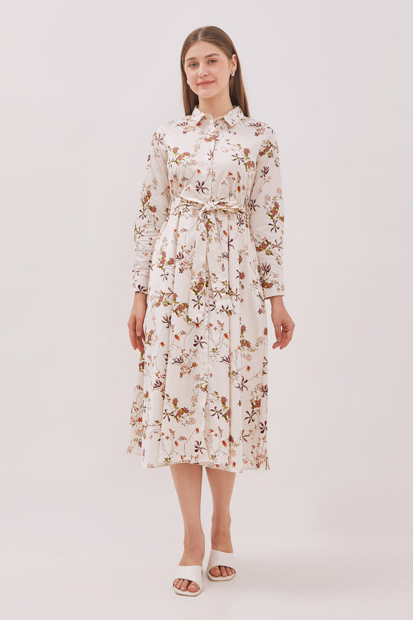 Gaun maxi bermotif bunga dengan detail cut & sewn asimetris, lengan bersiluet balong dan dilengkapi dengan tali sabuk dengan bahan dan motif yang sama.