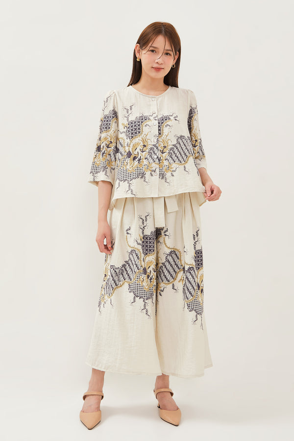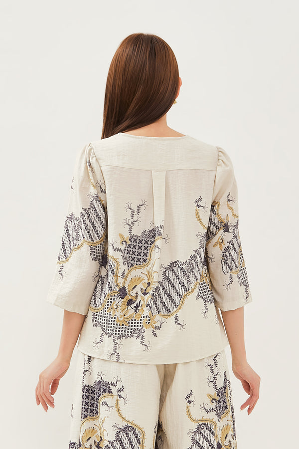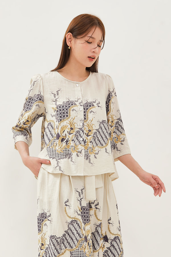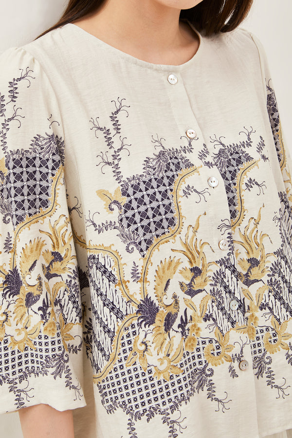Blus kerah bulat dengan detail print batik burung dan parang, bukaan kancing pada bagian plaket depan.