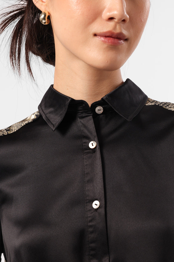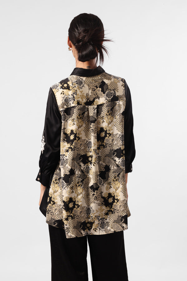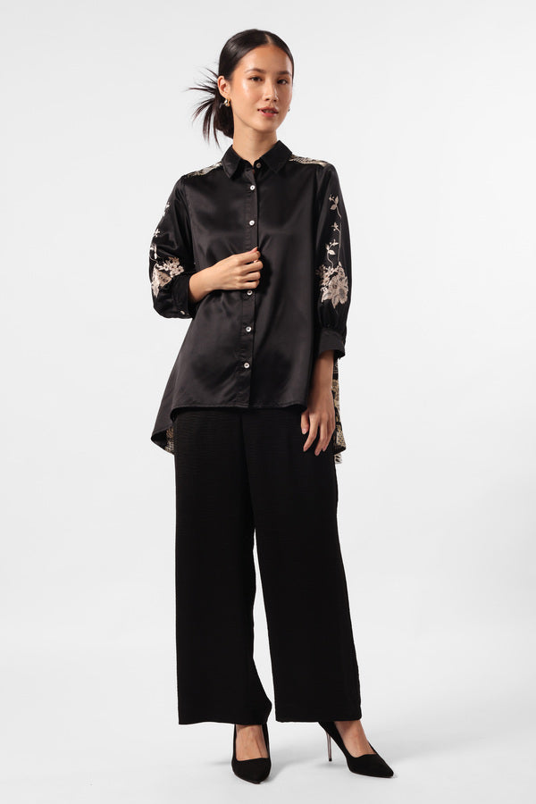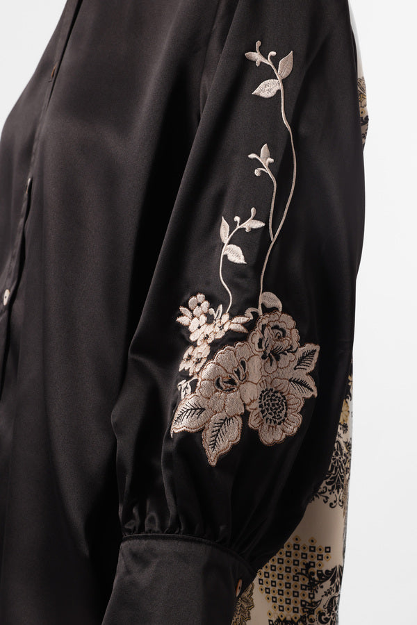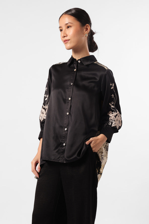 Kemeja satin kilau dengan detail print batik bunga paisley, bagian lengan dengan embroideri motif bunga.