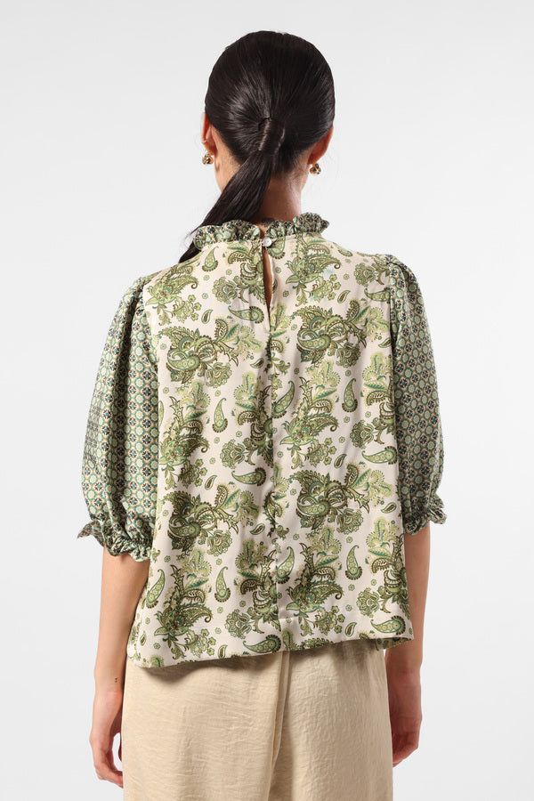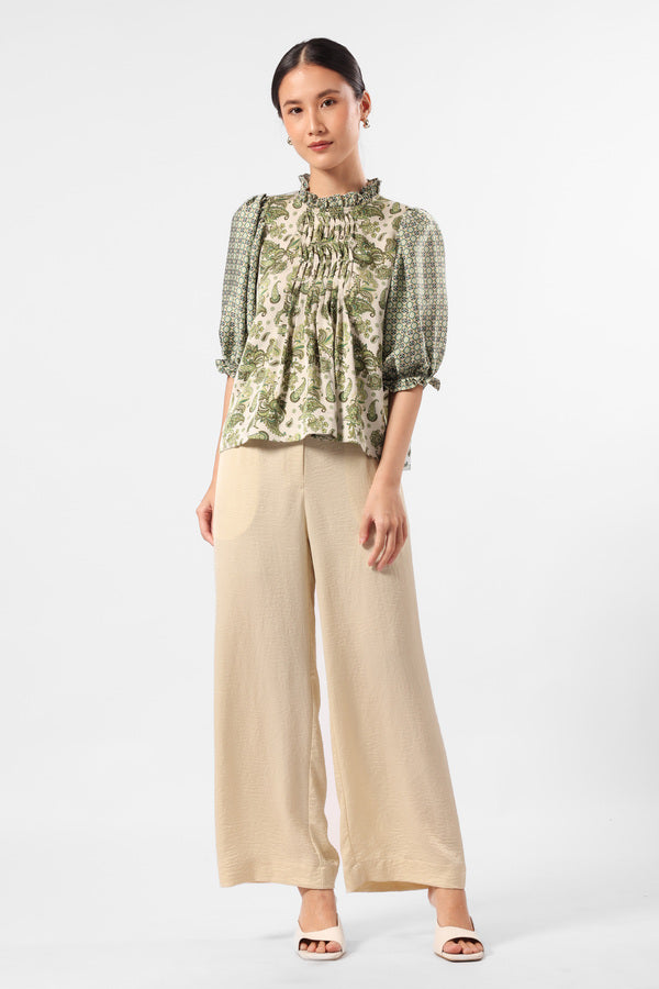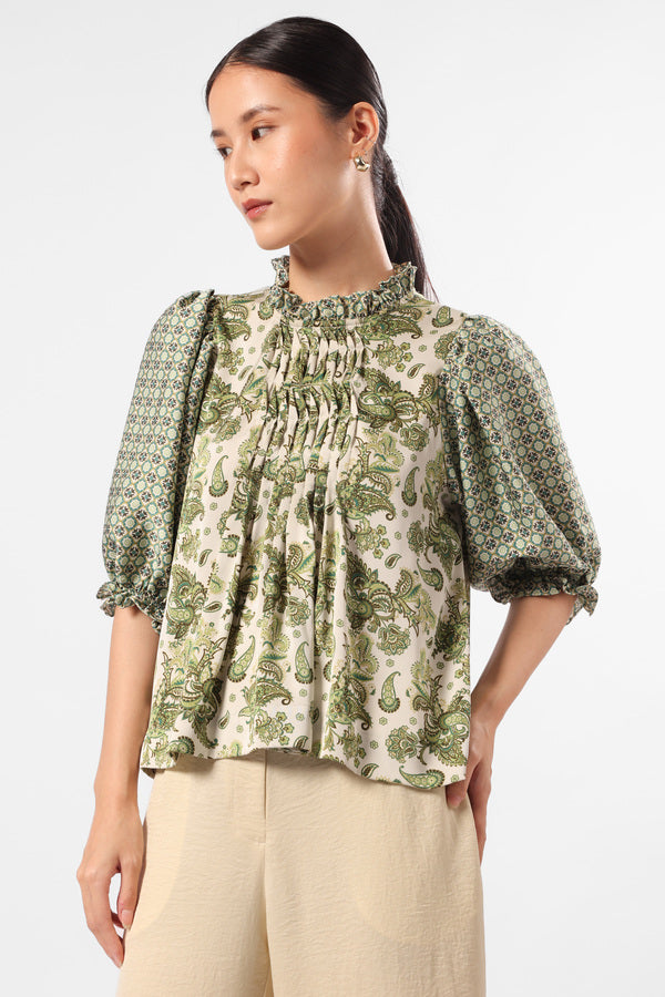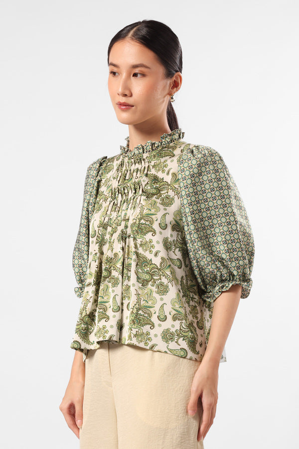 Blus satin motif paisley dengan detail lengan print geometris, kerah ruffle, pintuck pada bagian depan, dan lengan balon.