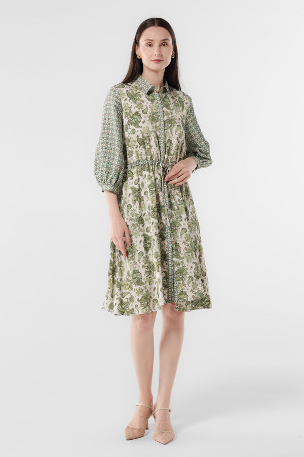 Gaun midi satin lengan panjang dengan detail motif paisley, bagian lengan motif geometris, terdapat aksen tali kerut pada bagian pinggang supaya membentuk garis pinggang pada saat dipakai.