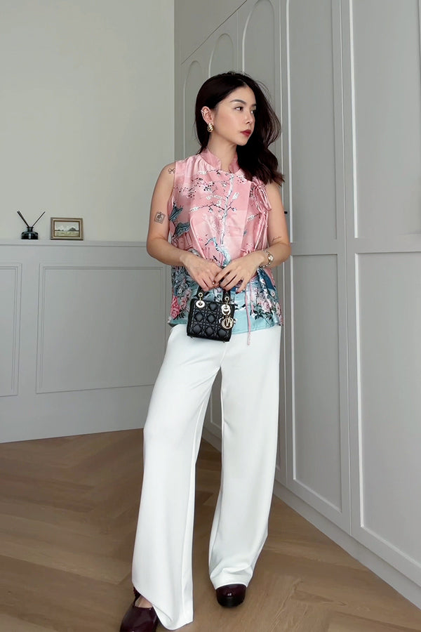 Blouse Aline overlap tanpa lengan. Dibuat dari bahan poly satin yang nyaman dipakai dengan motif special CNY lukisan pedesaan china dengan nuansa warna pink yang cantik. Detail tali pita pada bagian depan mempercantik blouse ini. Dapat dipakai dengan paduan celana panjang polos. Dapat dipakai untuk acara formal maupun non formal.