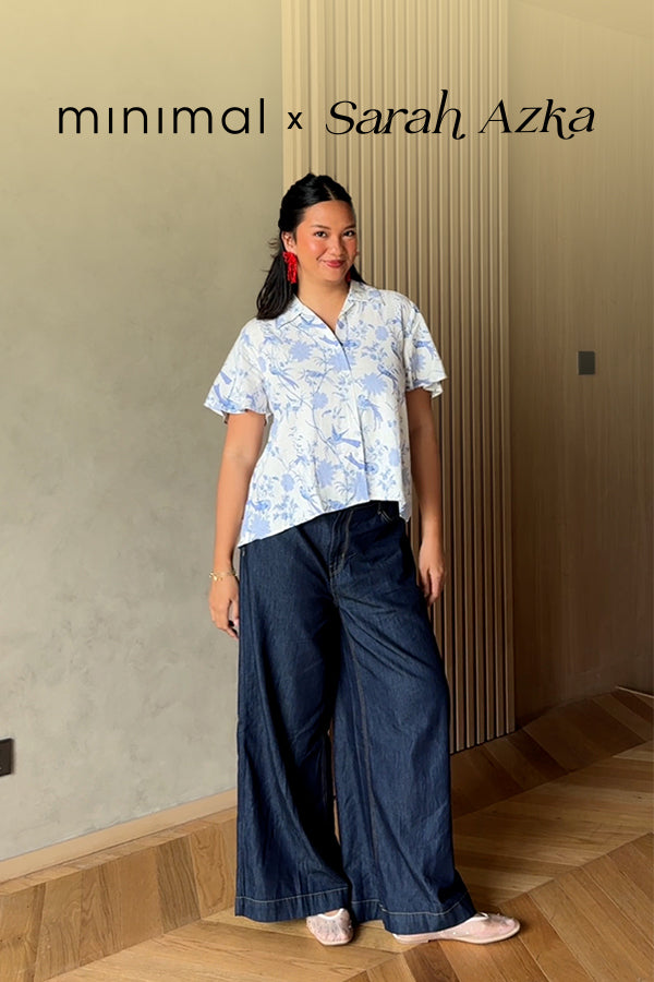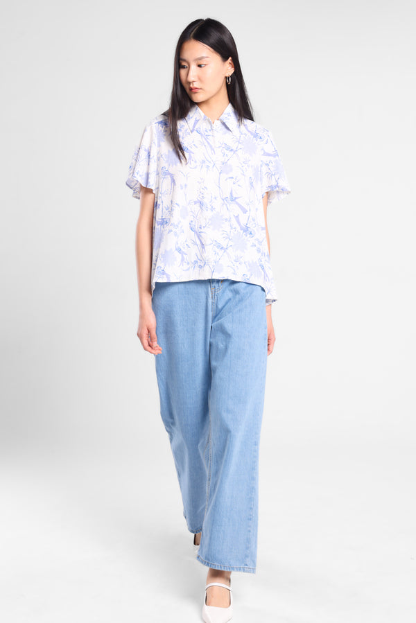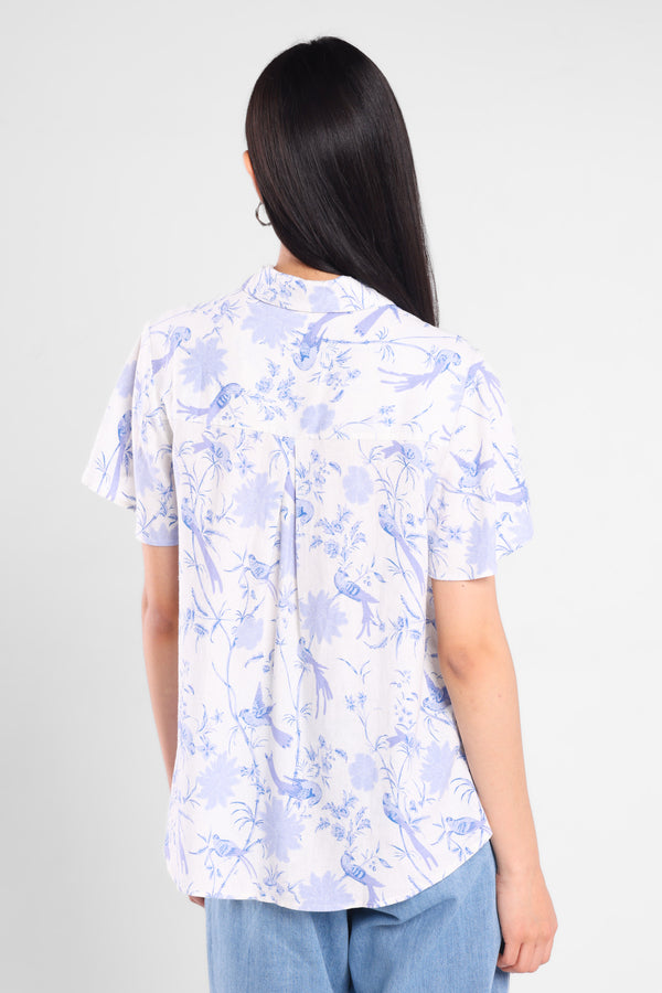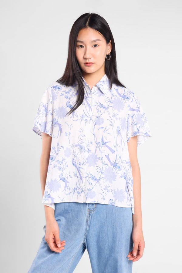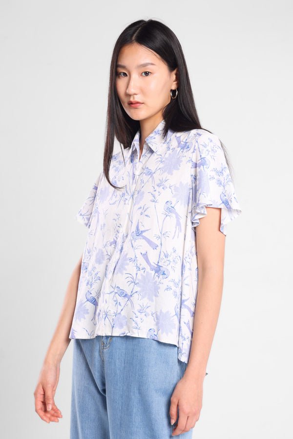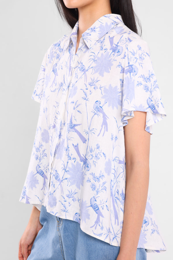 Kemeja lengan pendek dengan model lengan kupu-kupu berbahan linen blend yang adem, warna dan motif print yang feminim