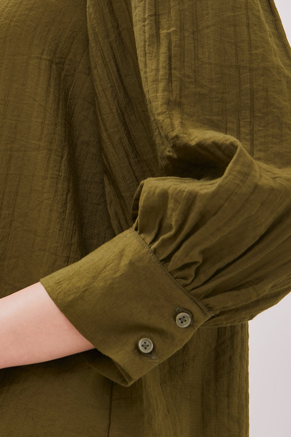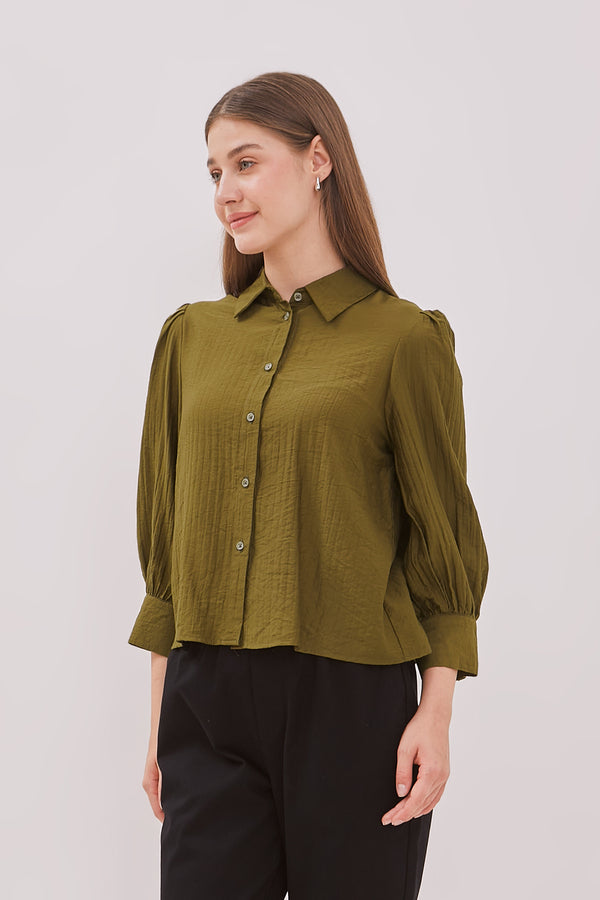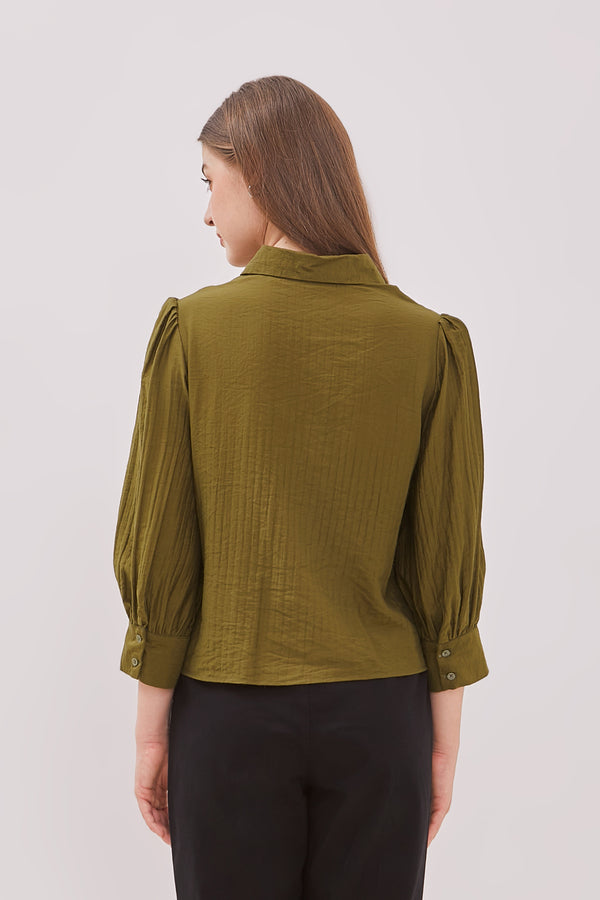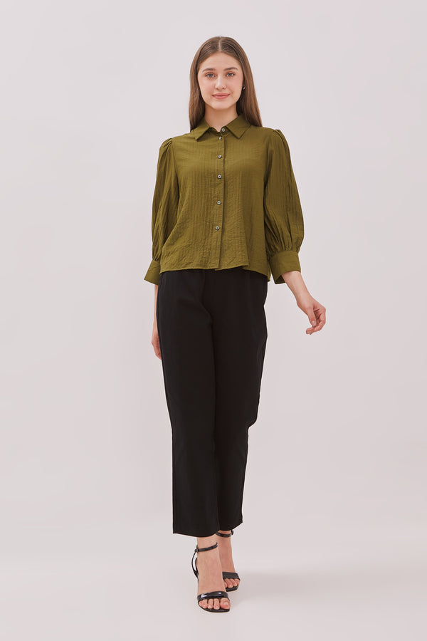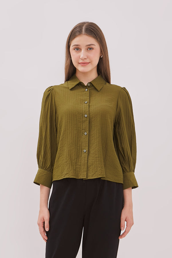 Blus lengan balon bermotif garis dengan detail bukaan kancing pada bagian depan.