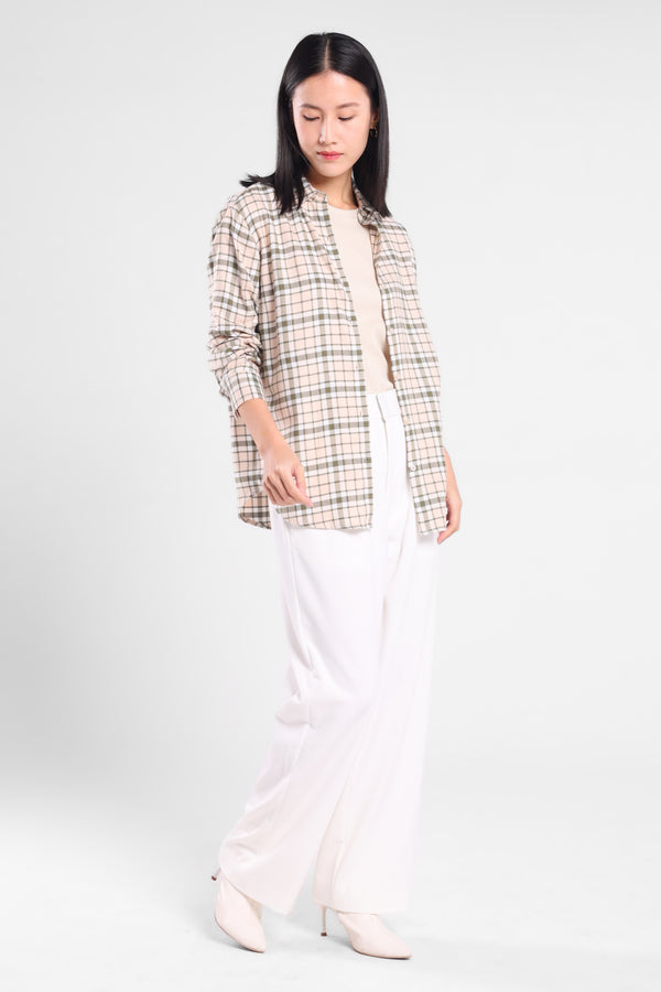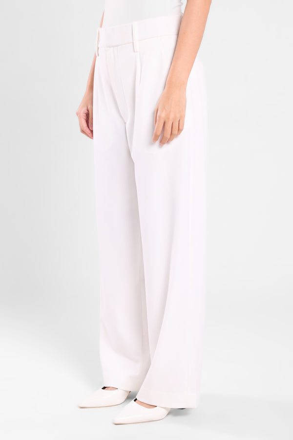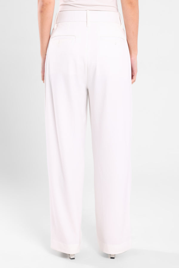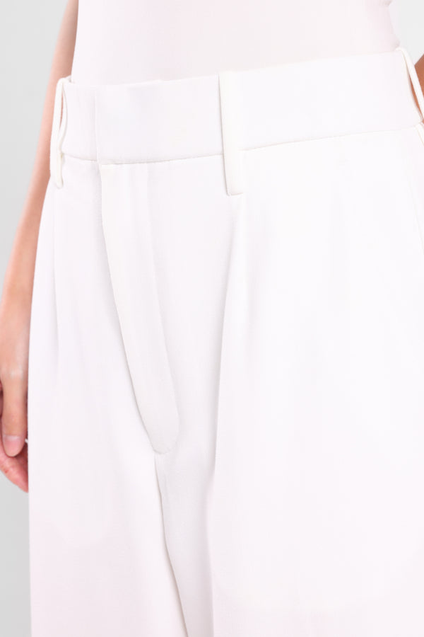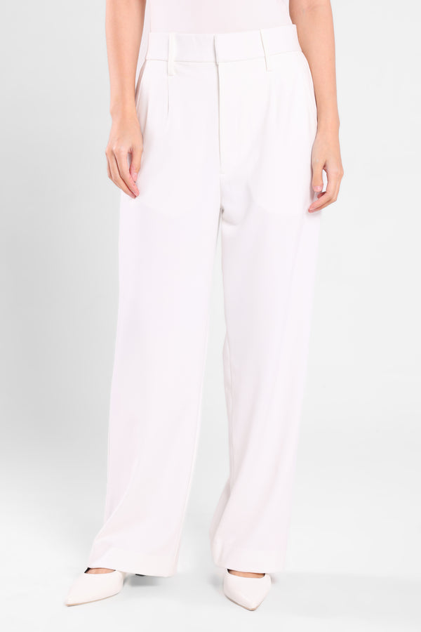 Celana panjang dengan saku di depan dan saku paspoil hias di belakang. Penutup depan dengan ritsleting, kancing bagian dalam, dan kait. Hem yang lebih lebar untuk siluet lebar yang terlihat lebih lurus.