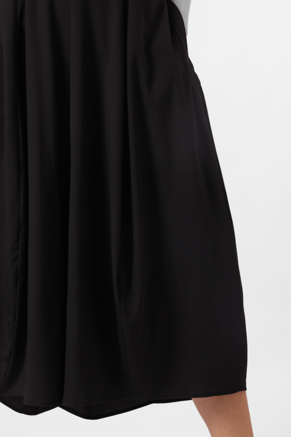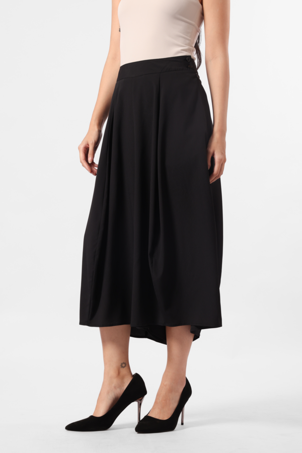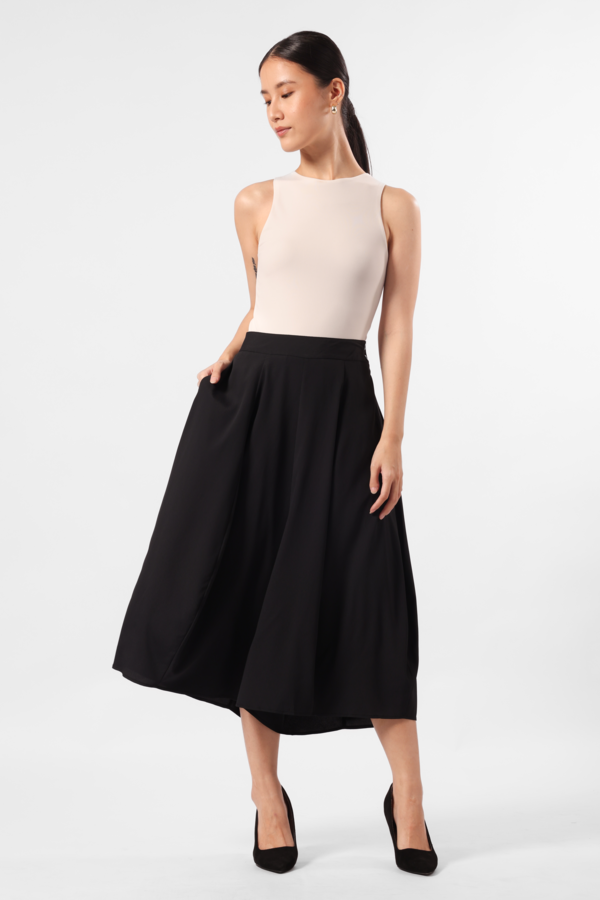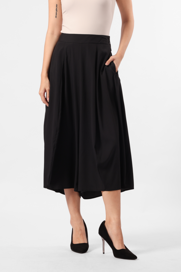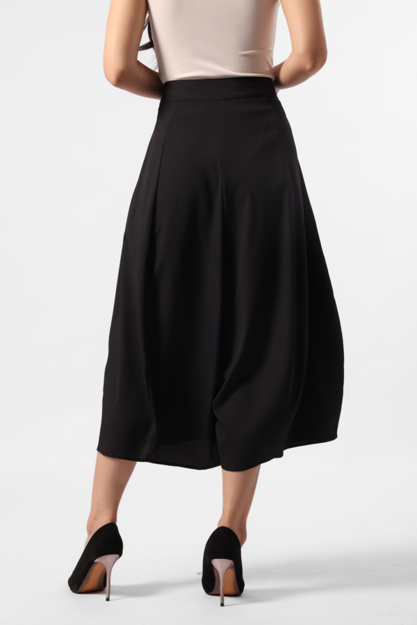 Kulot lipit flowy bersiluet balon dengan detail kantong dan bukaan zipper dan kancing pada bagian samping.