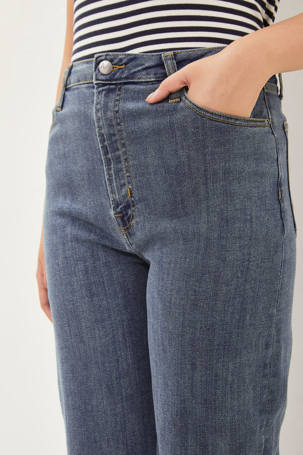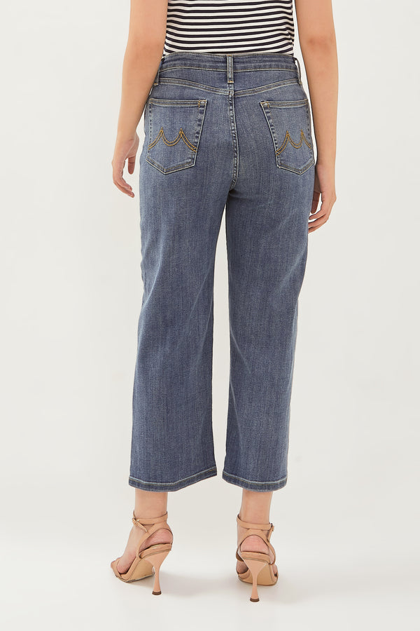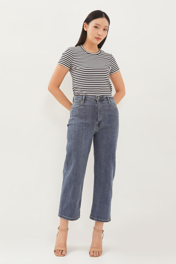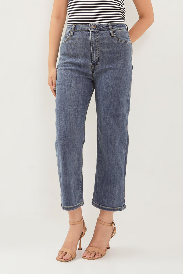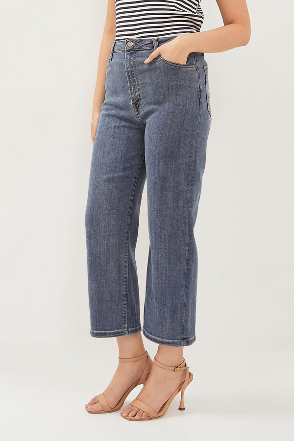 Celana denim stretch ankle length dengan siluet lurus, terdapat 5pocket pada bagian depan, kantong belakang dengan detail embroideri logo.