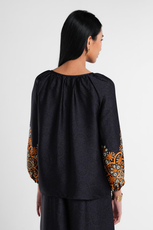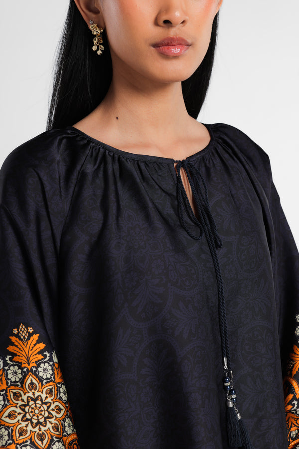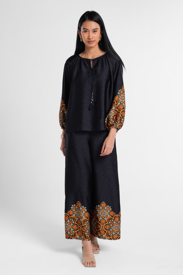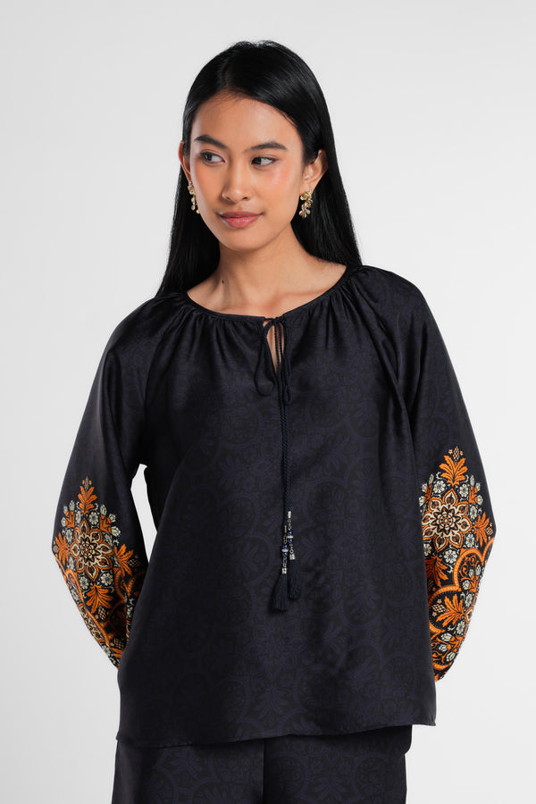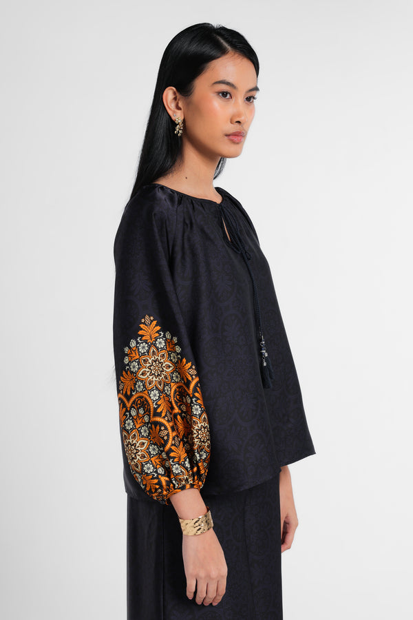 Blouse dengan Motif Etnik dipadukan dengan Tussel dirancang dalam komposisi warna Navy Dark. Menciptakan tampilan Lebaran yang elegan tanpa terasa berlebihan. Potongan clean dan siluet minimal menjaga motif tetap terlihat refined. Mudah dipadukan dengan berbagai bawahan