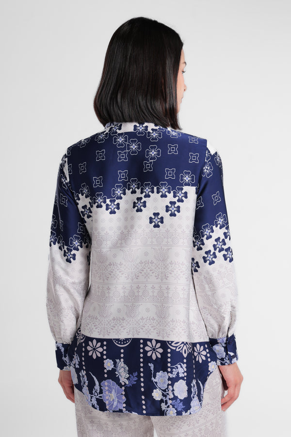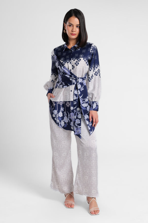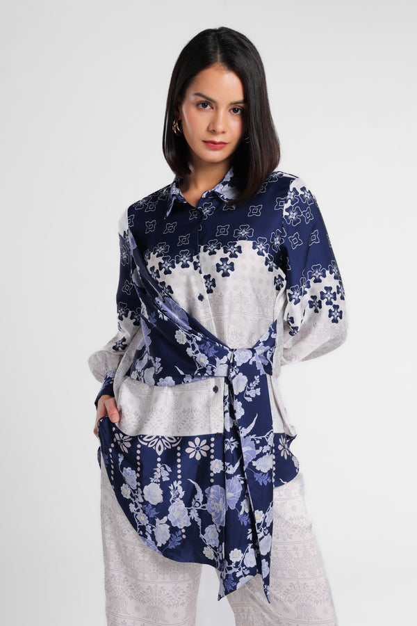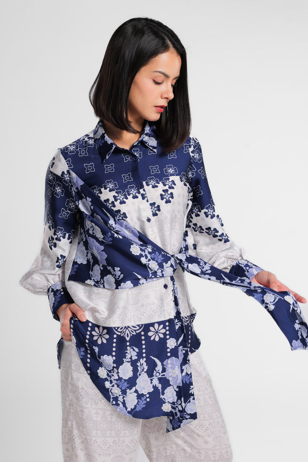 Kemeja bahan satin motif floral kerah lapel. Detail depan menyilang depan dengan simpul kain berbahan sama. Penutup dengan kancing bagian depan. Lengan panjang dengan ujung manset dengan kancing detail gathered. Siluet asimetris.