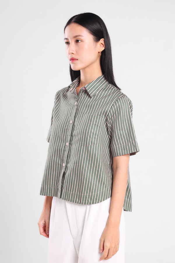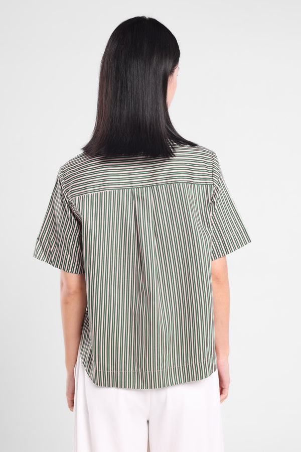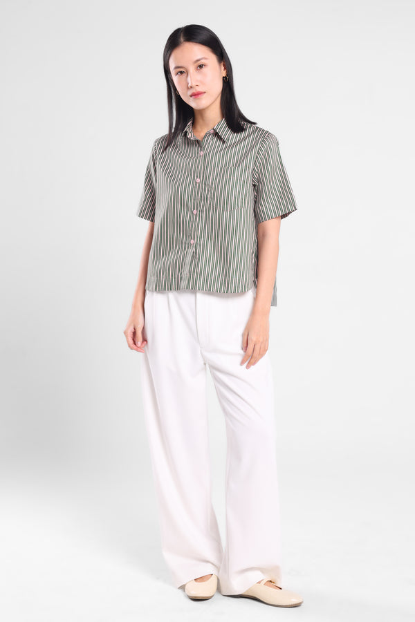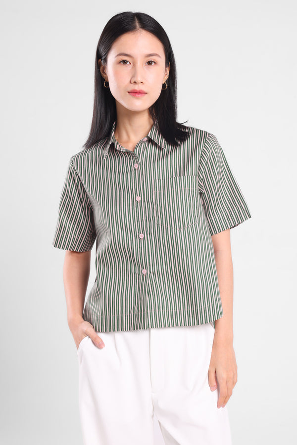 Kemeja lengan pendek dengan motif garis vertikal yang memberikan siluet ramping dan kesan modern. Dilengkapi detail kerah klasik dan saku dada, kemeja ini cocok untuk tampilan kasual yang tetap rapi dan stylish.