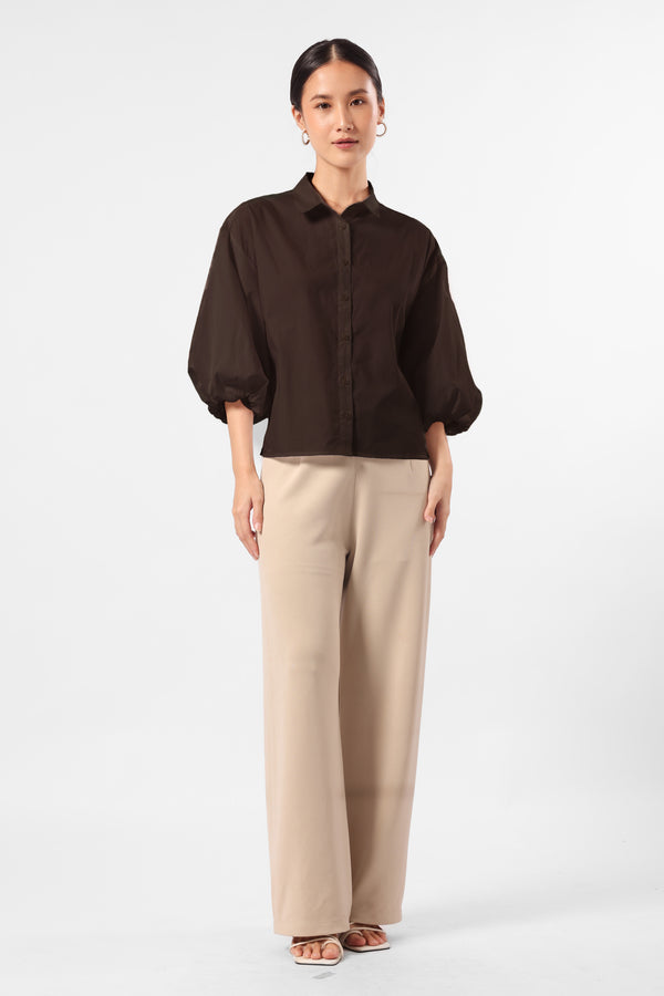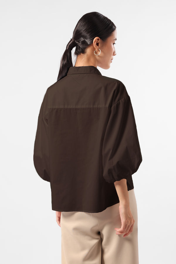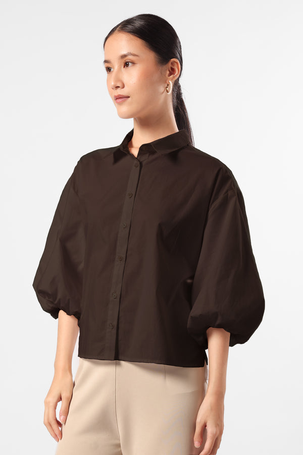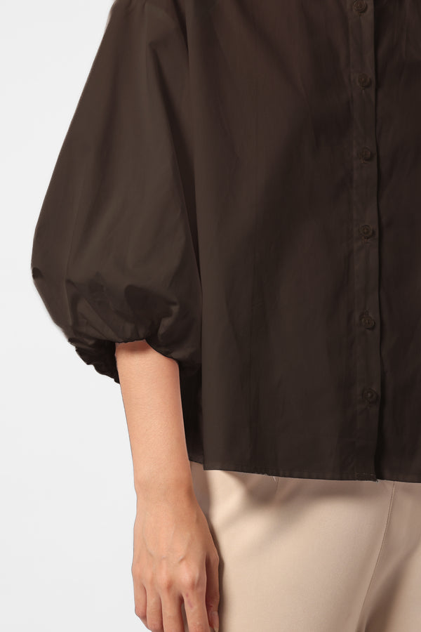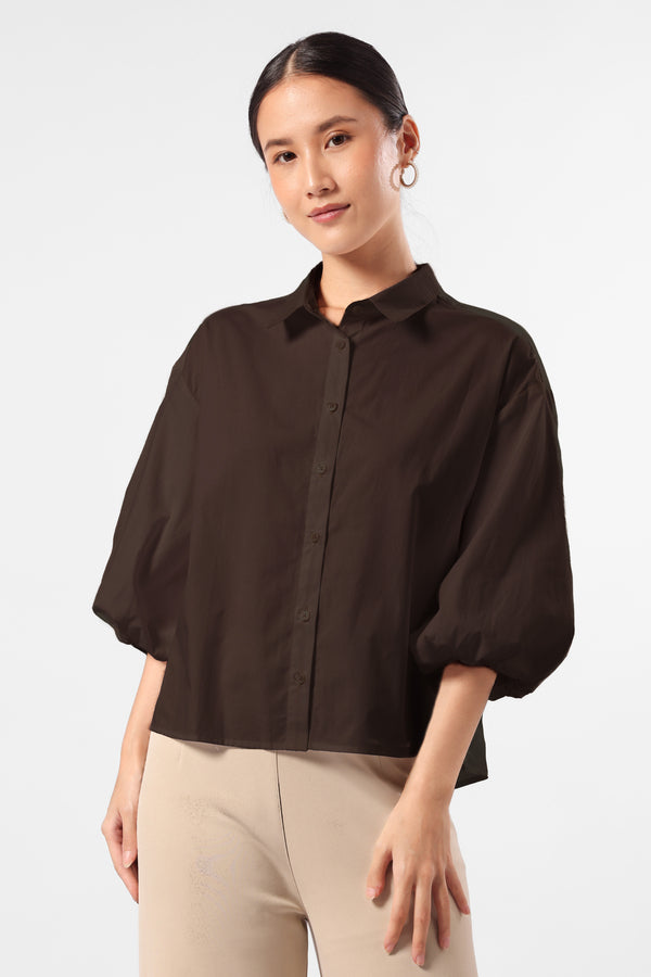 Kemeja katun lengan balon dengan detail bukaan kancing pada bagian plaket depan.