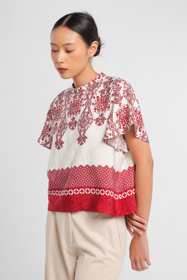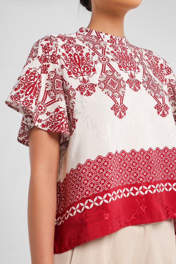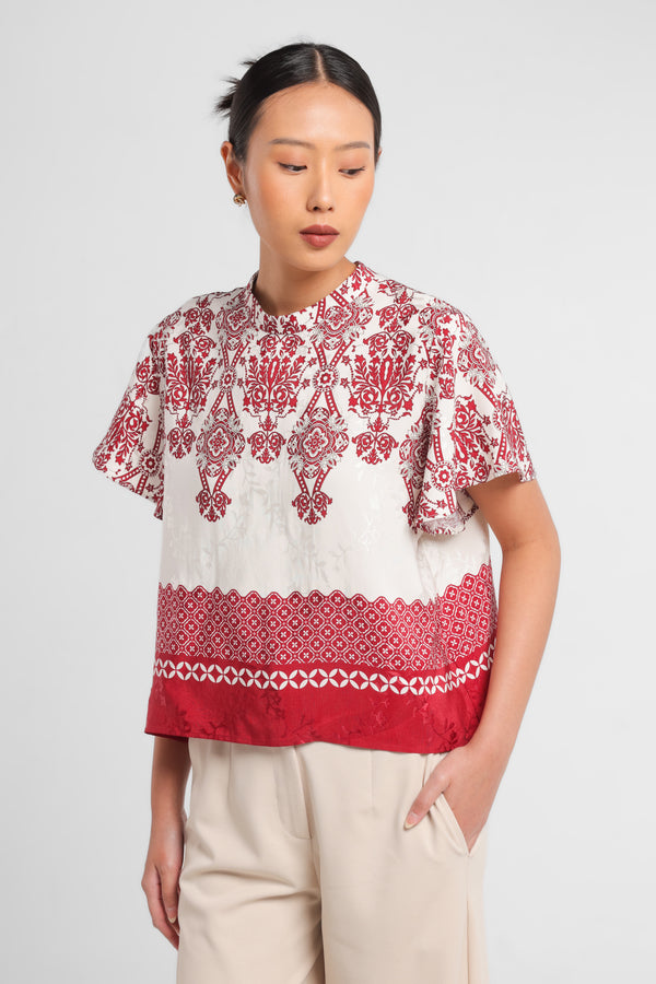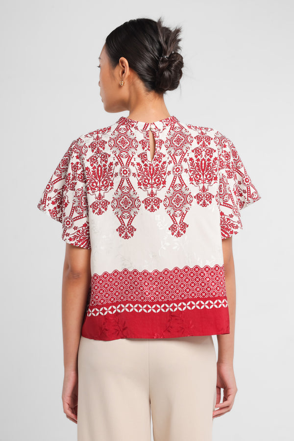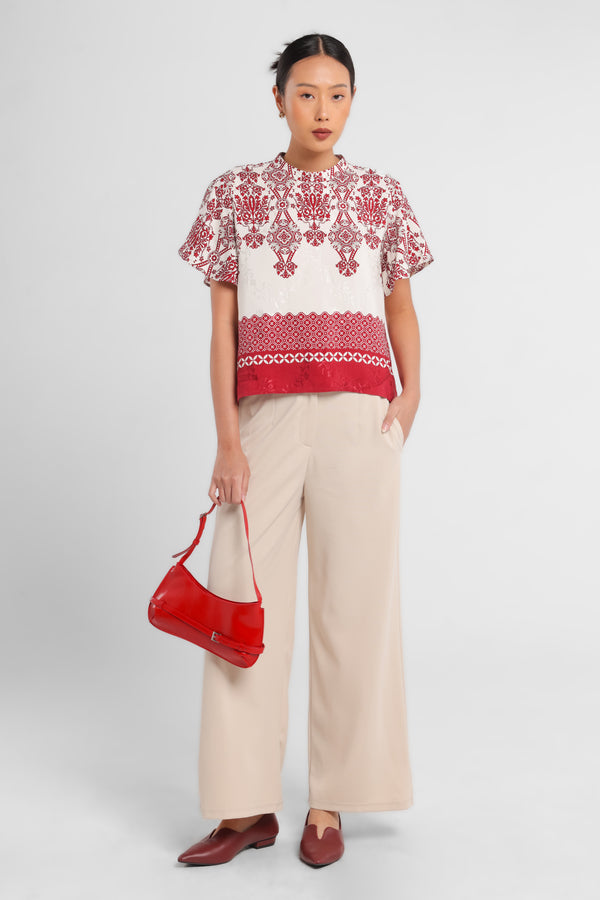 Blouse bahan poly jaquard dengan motif print Batik Ornamen Kawung lengan pendek dengan detail krah tinggi. Dibuat dari bahan yang tidak mudah kusut dan nyaman untuk dipakai pada acara formal ataupun non formal.