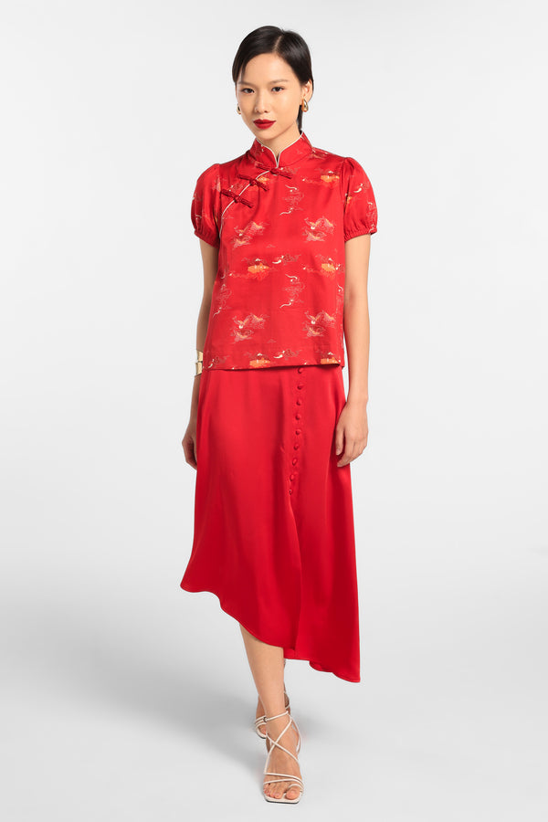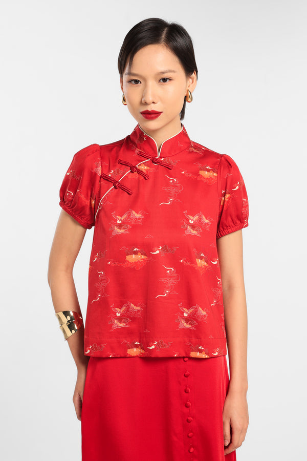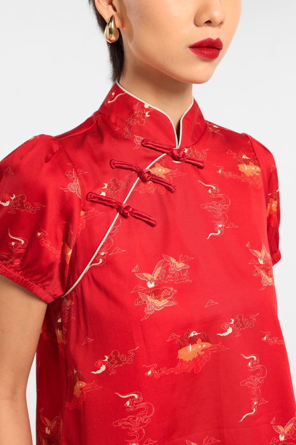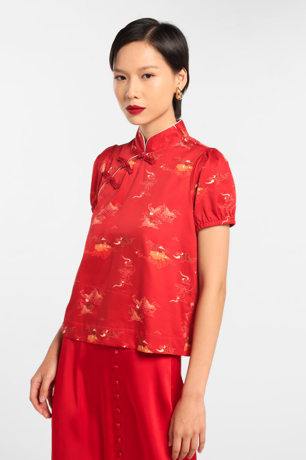 Blouse Aline dengan lengan pendek puff . Dibuat dari bahan katun satin yang nyaman dipakai dan motif special CNY nuansa warna merah dan gold. Detail kancing china pada bagian depan mempercantik blouse ini. Dapat dipakai dengan paduan celana panjang polos. Dapat dipakai untuk acara formal maupun non formal.