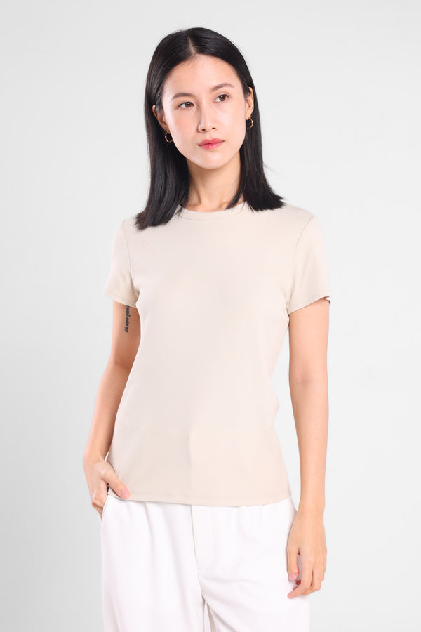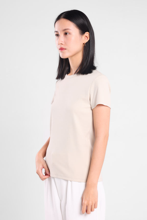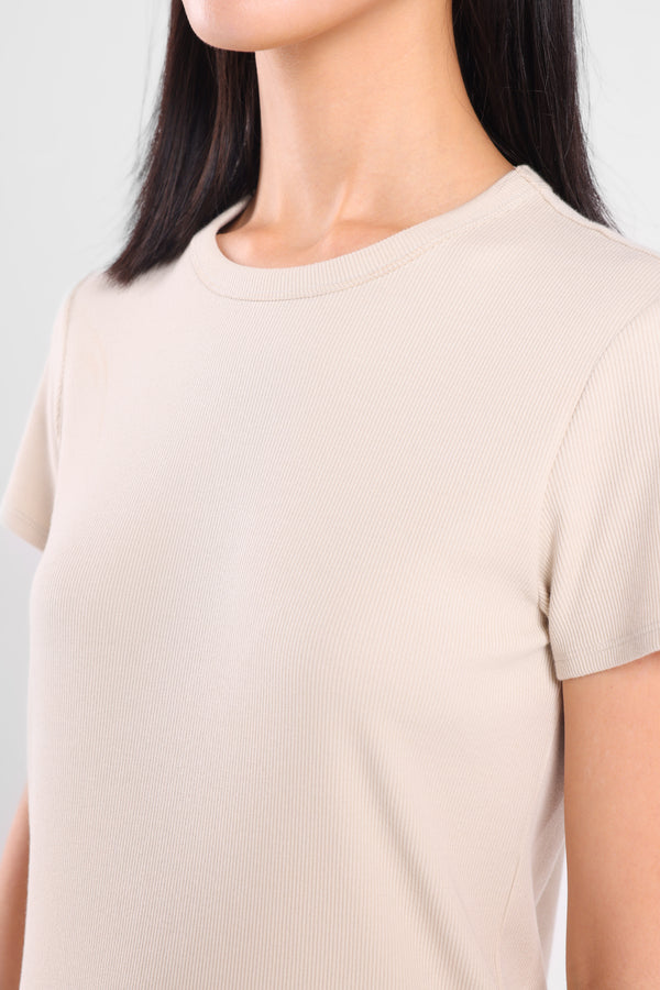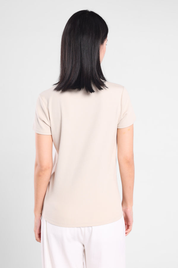 T-shirt berbahan campuran katun dengan tekstur alami yang lembut. Siluet yang pas dengan detail ramping, cocok untuk gaya kasual, sporty, ataupun gaya yang lebih elegan. T-shirt dengan lengan pendek, neckline dibuat dengan bahan yang senada agar mudah dipadupadankan.