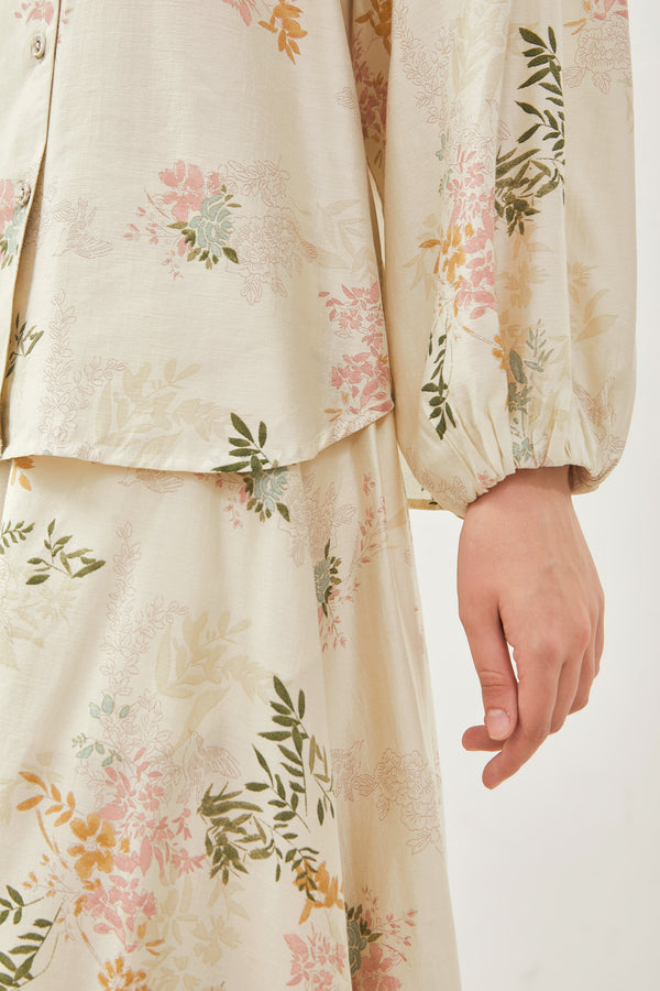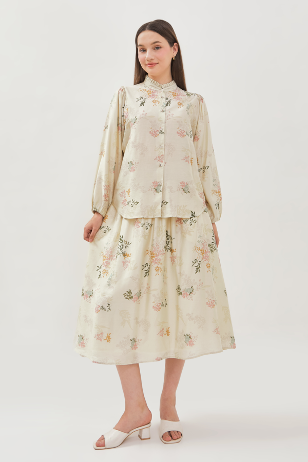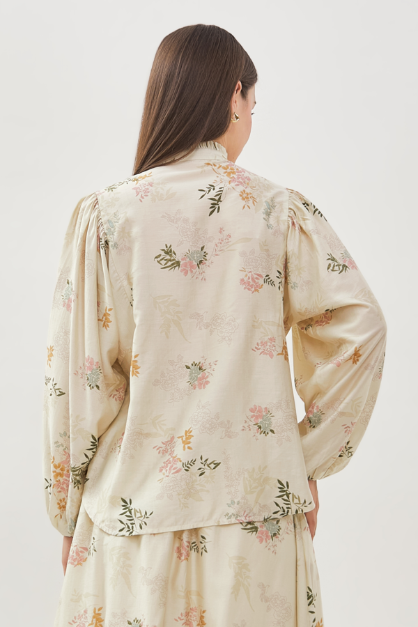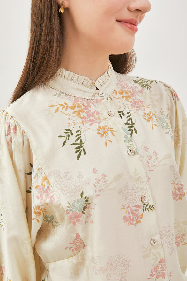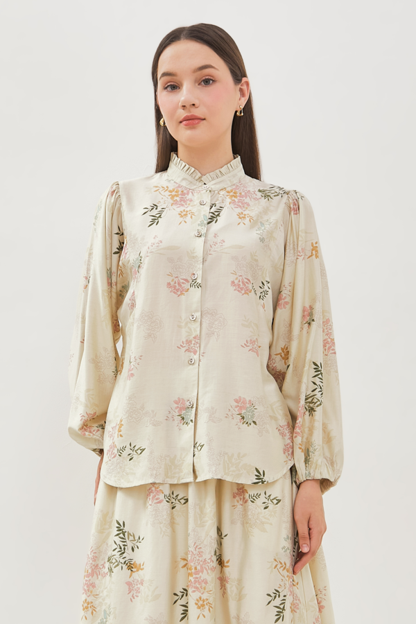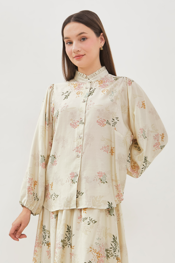 Blus terbuat dari bahan rayon. Kerah ruffle dan lengan panjang berkaret. Penutup depan dengan kancing, motif bunga.