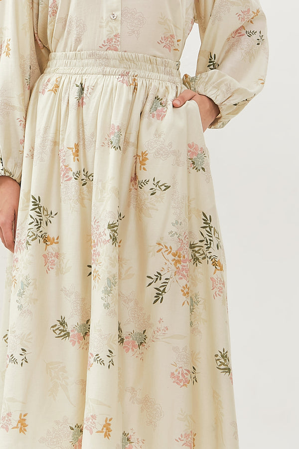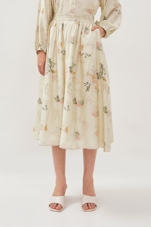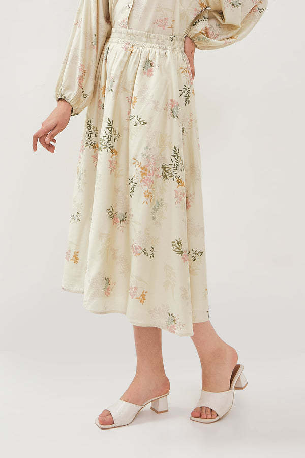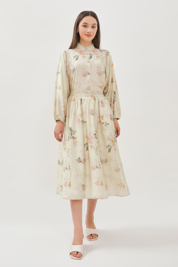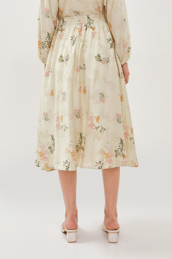 Rok midi terbuat dari bahan rayon. Mid waist dan karet di bagian pinggang, motig bunga.