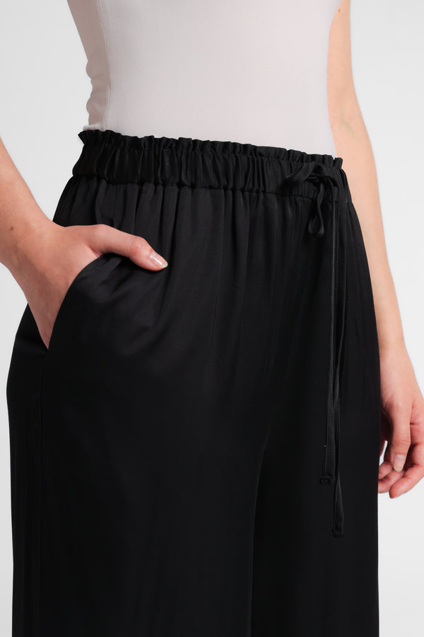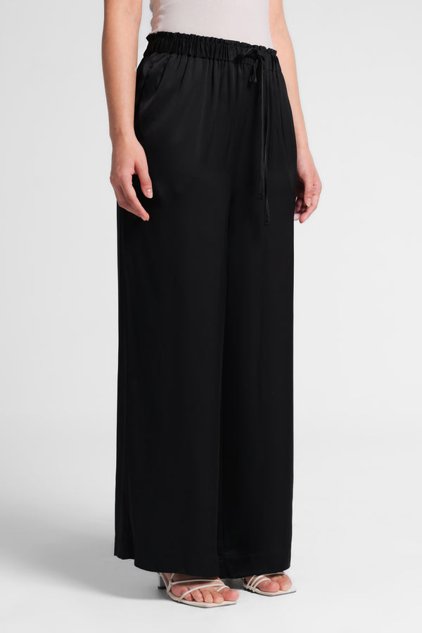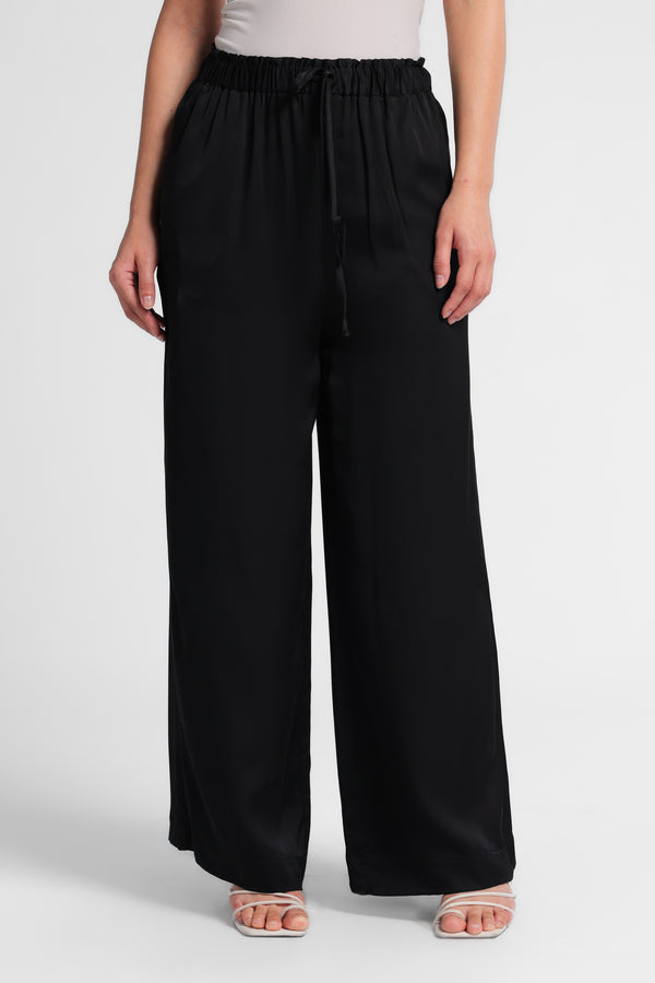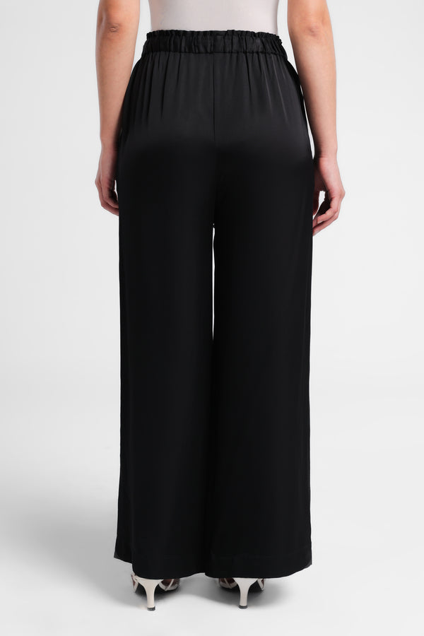 Celana panjang yang dibuat bahan satin. Mid-rise dan pinggang elastis yang dapat disesuaikan dengan tali serut. Saku samping . Kaki lebar.