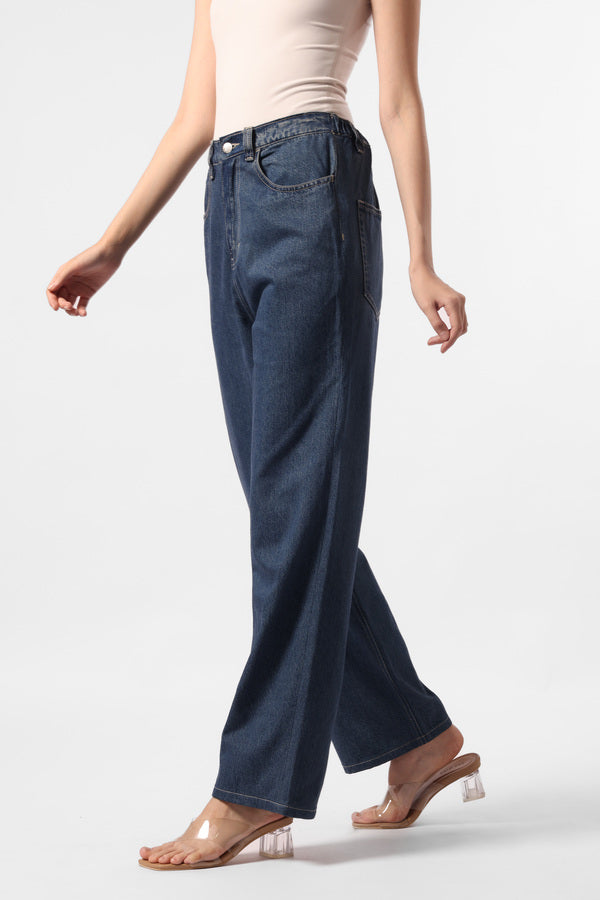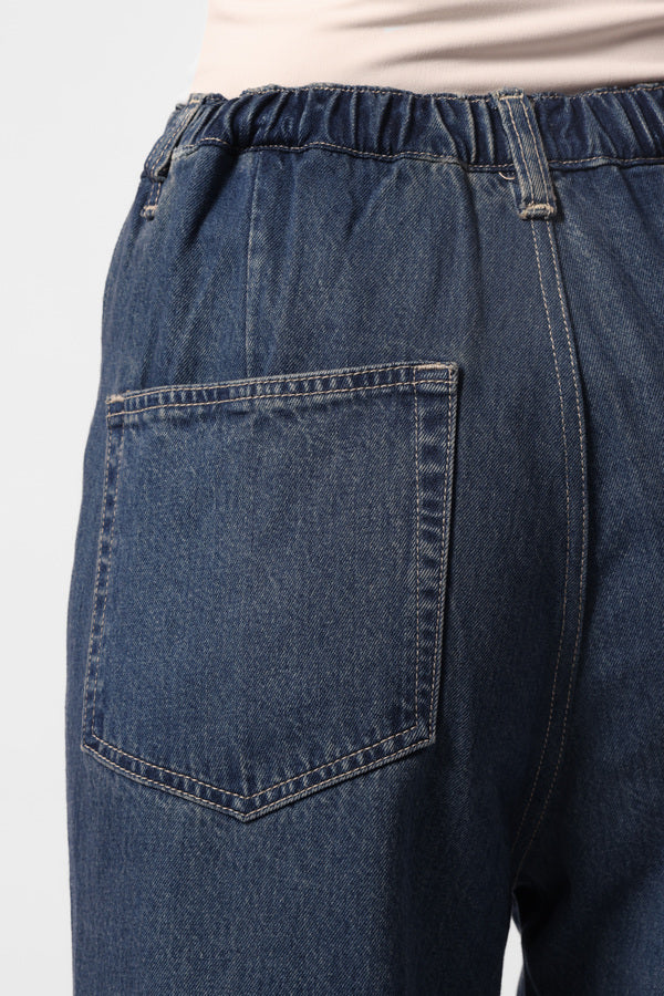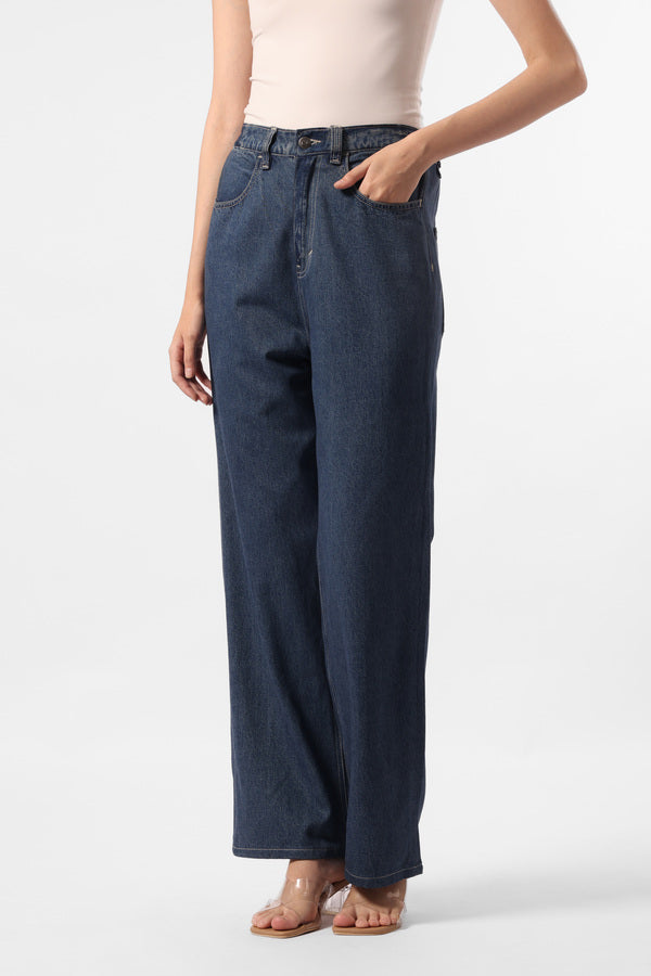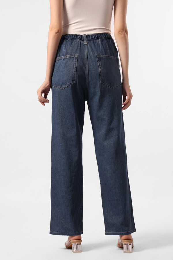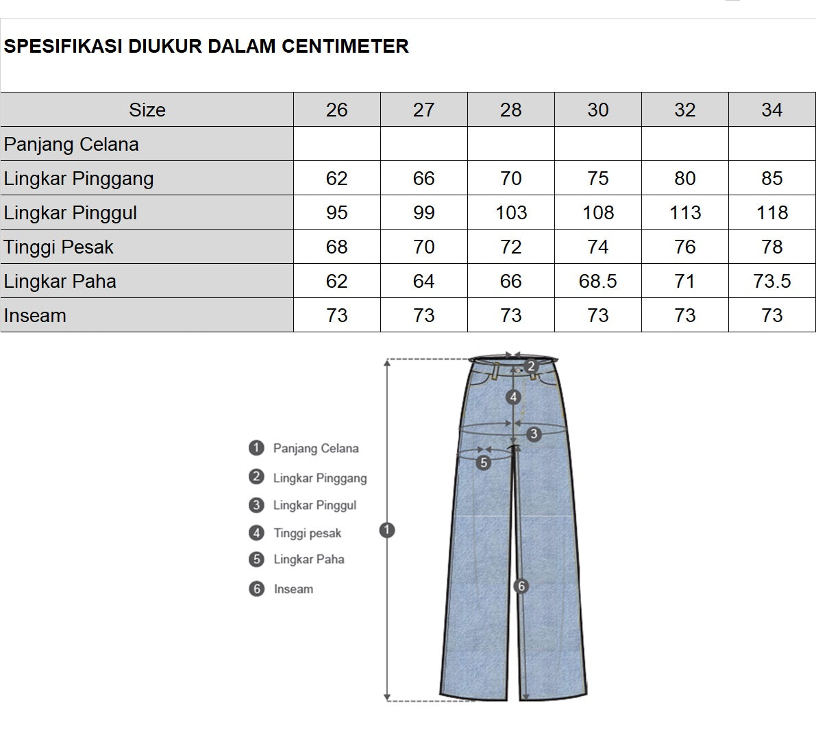 Celana denim fit lebar dan lurus dengan detail 5pocket dan karet pada bagian waistband belakang untuk memberikan kesan nyaman pada saat dipakai.