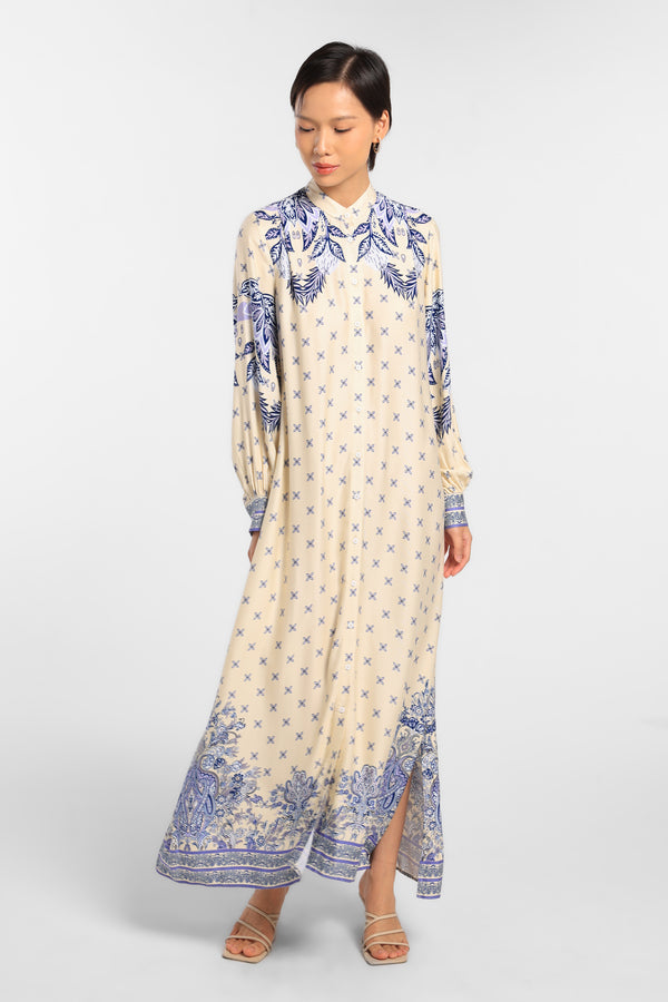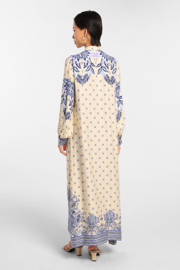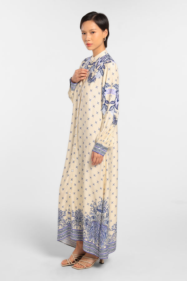 Gamis Printed dengan Motif Eksklusif yang dirancang dalam komposisi warna Beige lembut untuk tampilan Raya yang anggun dan minimal.