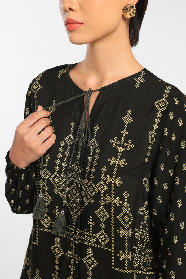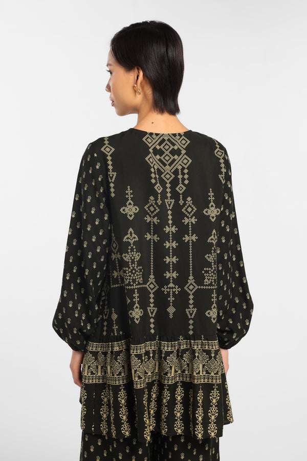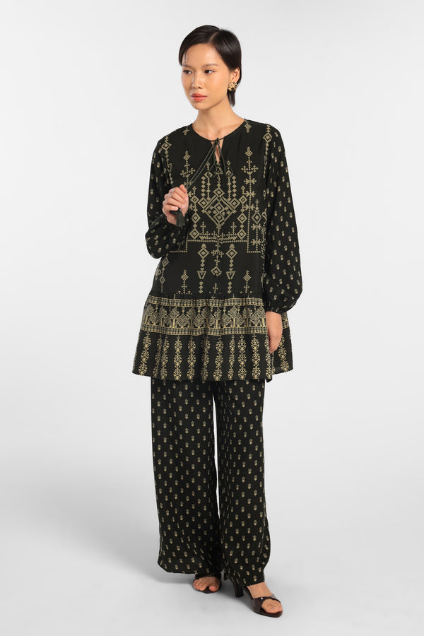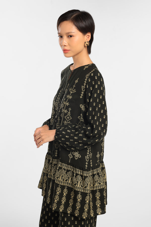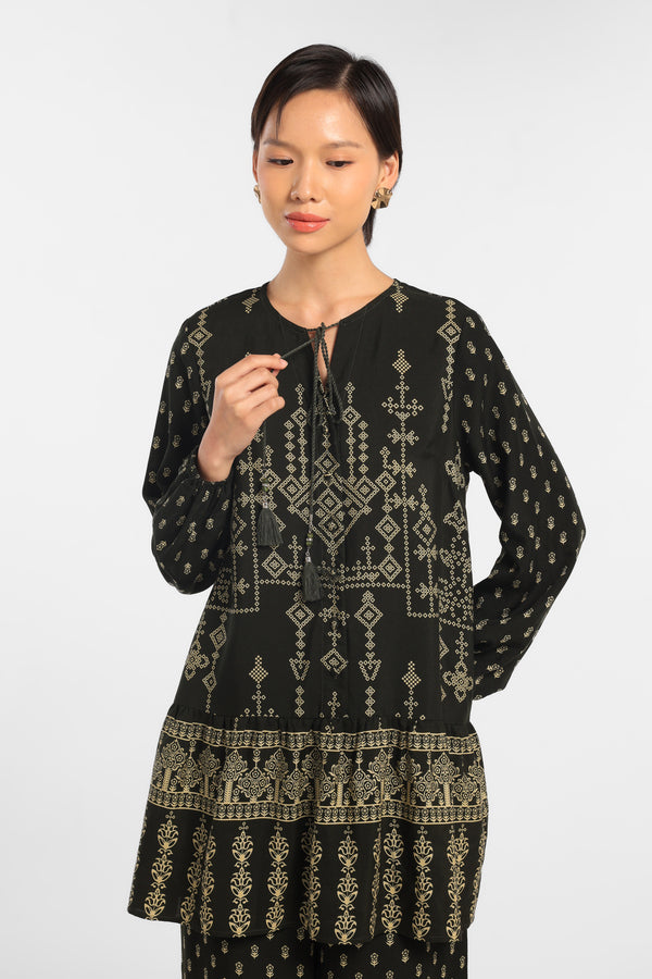 Blouse Printed dengan motif Eksklusif dirancang dalam komposisi warna Green Dark lembut, dengan detail Tussel dan Gathered. Menciptakan tampilan Lebaran yang elegan tanpa terasa berlebihan. Potongan clean dan siluet minimal menjaga motif tetap terlihat refined. Mudah dipadukan dengan berbagai bawahan untuk gaya yang effortless