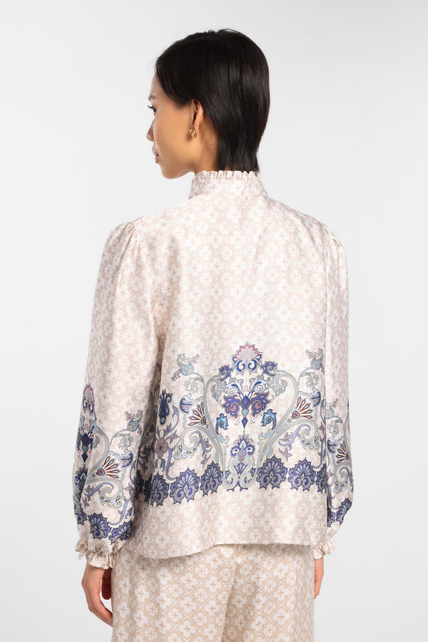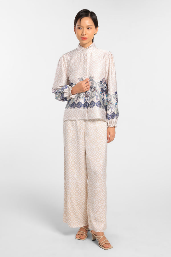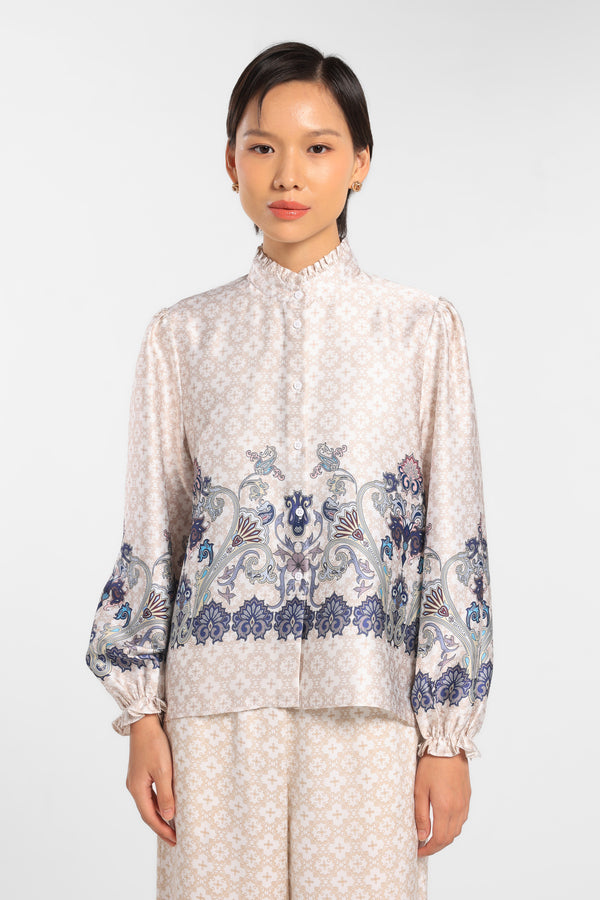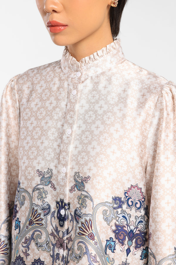 Blouse Printed dengan motif Eksklusif detail Ruffle di Kerah dirancang dalam komposisi warna Off White lembut.