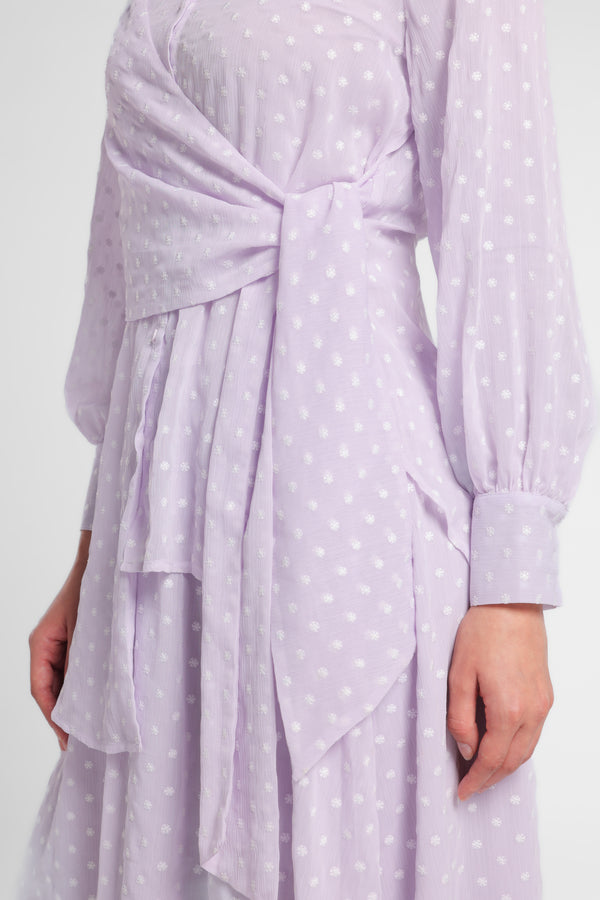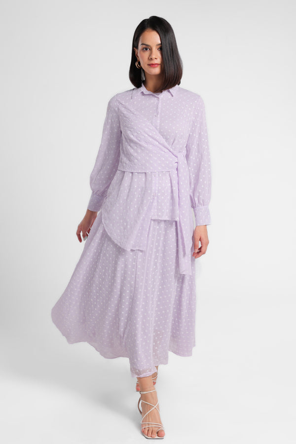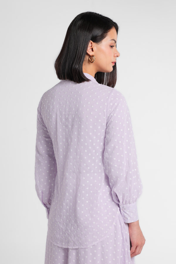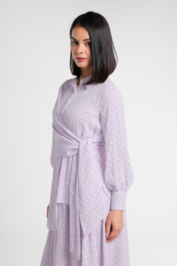 Kemeja bahan tekstur motif dot kerah lapel. Detail depan menyilang depan dengan simpul kain berbahan sama. Penutup dengan kancing bagian depan. Lengan panjang dengan ujung manset dengan kancing detail gathered. Siluet asimetris. Terdapat Inner manset terpisah.