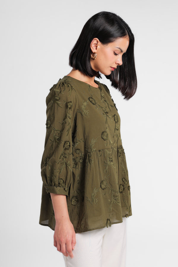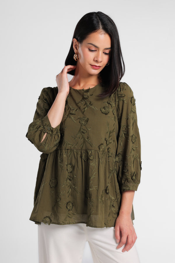 Peplum Blouse dengan bahan bertekstur 3D embroidery dirancang dalam komposisi warna Olive. Menciptakan tampilan Lebaran yang elegan tanpa terasa berlebihan. Potongan clean dan siluet minimal menjaga motif tetap terlihat refined.