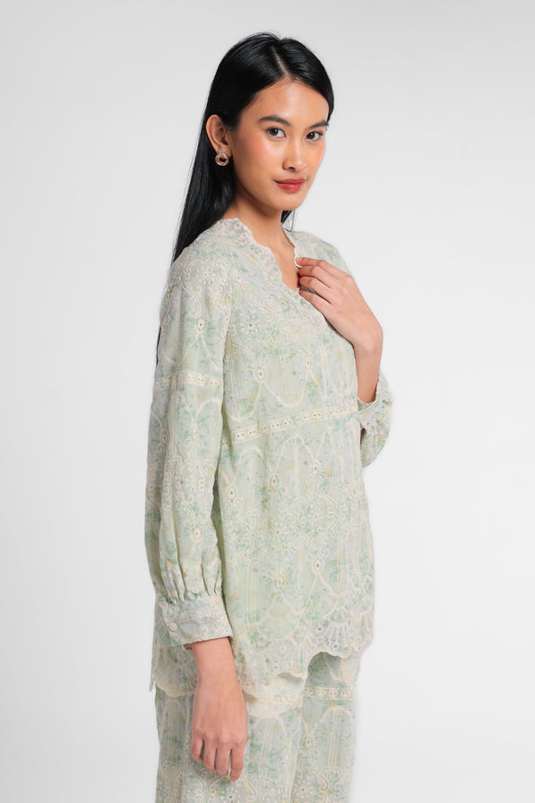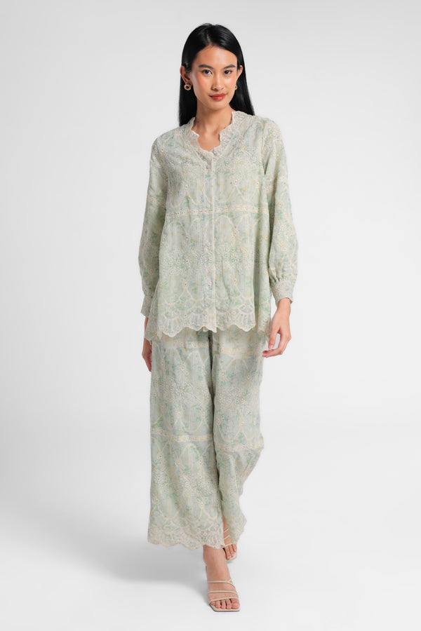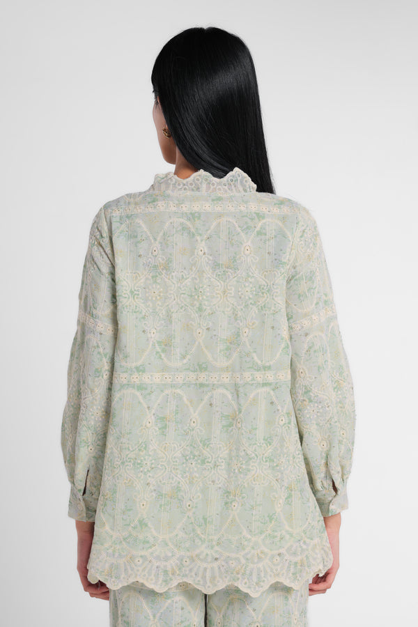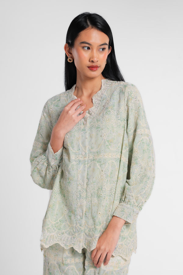 Kemeja bahan embroidery, kerah V dengan detail ruffle. Penutup depan dengan kancing. Lengan panjang dengan ujung manset dengan kancing detail gathered. Terdapat lapisan furing bagian dalam.