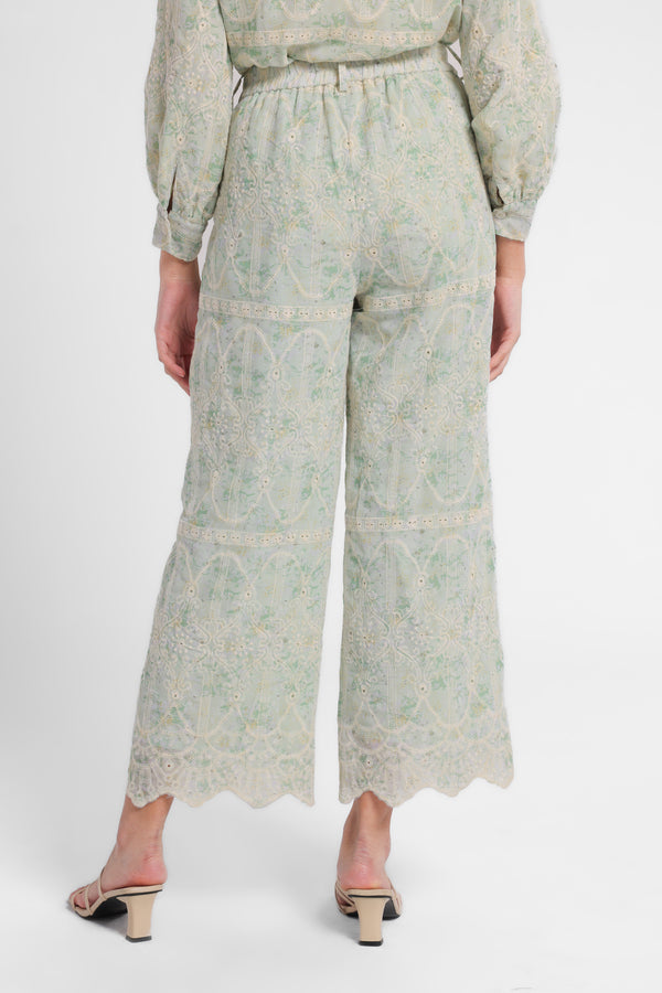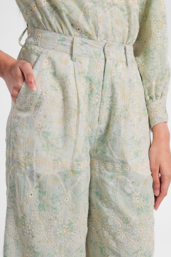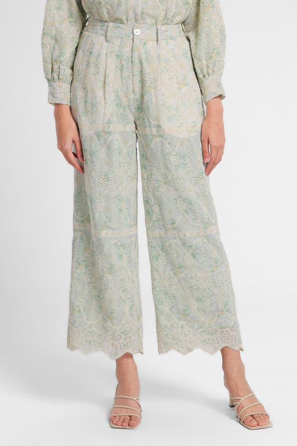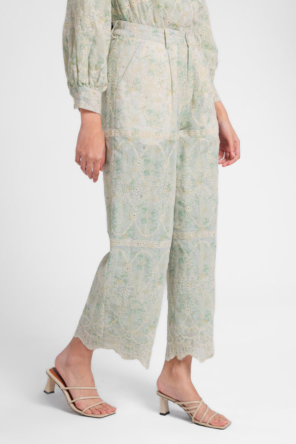 Celana panjang bahan embroidery. Mid-rise dan bagian belakang terdapat karet agar nyaman dipakai. Terdapat saku samping, dan detail rapi bagian depan. Penutup depan dengan ritsleting dan pengait. Terdapat lapisan furing bagian dalam.