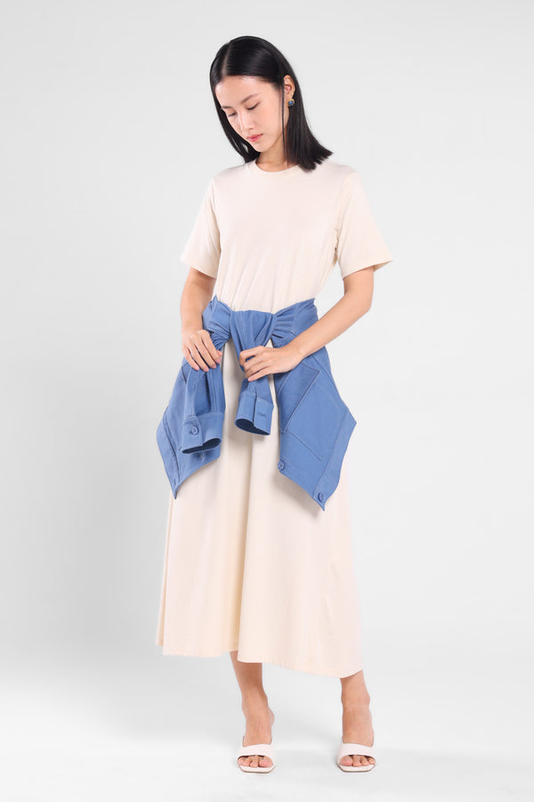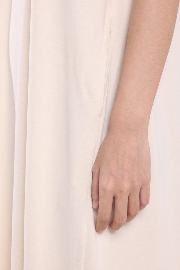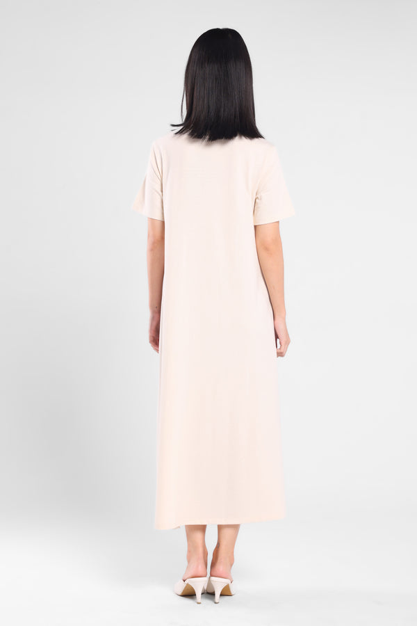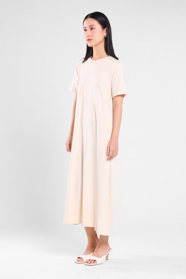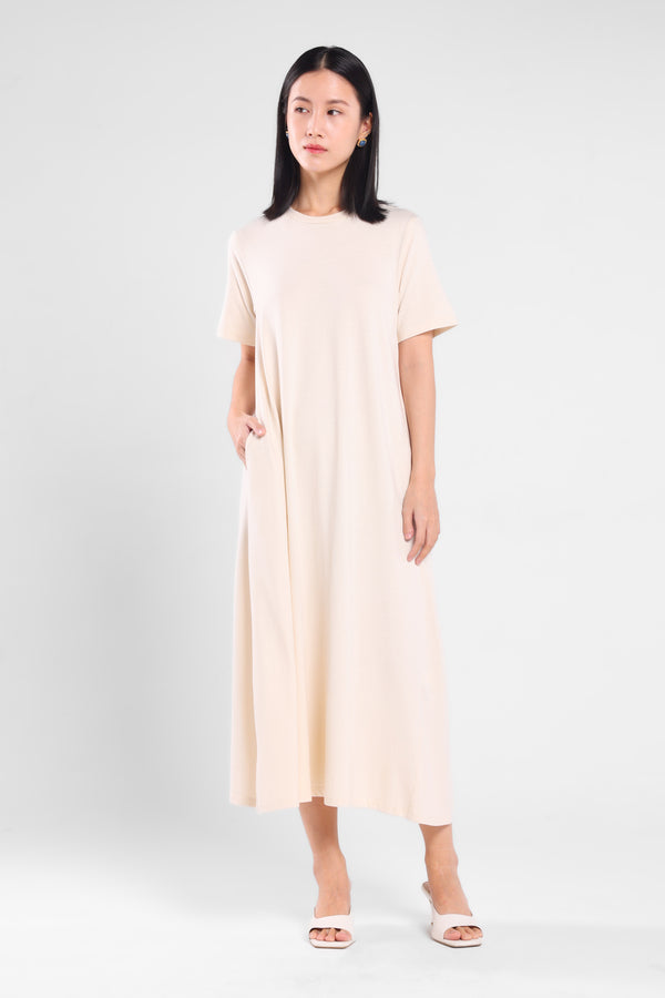 Dress siluet A-line melebar yang cukup rileks untuk memberi coverage.