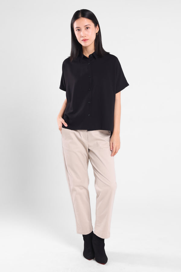 Blus berbahan rayon dengan technologi wrinkle resistance, kain anti-kusut yang dirancang agar tidak mudah kusut dan tetap terlihat halus, sehingga mengurangi kebutuhan untuk disetrika. Blus ini memiliki model dengan lebar bahu, dan lengan pendek loose untuk menciptakan siluet rileks sehingga nyaman untuk dipakai.