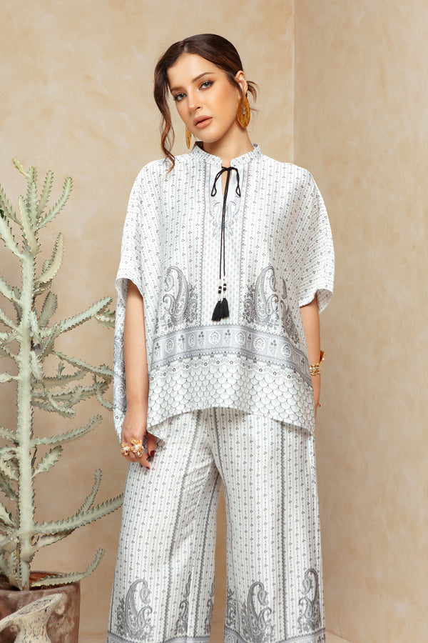 Blouse model kaftan pendek bahan satin polyester yang jatuh dan nyaman dipakai. Dibuat dari motif special bunga dengan warna monochrome yang mewah. Blouse ini dapat dipakai untuk acara formal Lebaran.