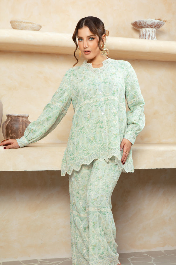 Kemeja bahan embroidery, kerah V dengan detail ruffle. Penutup depan dengan kancing. Lengan panjang dengan ujung manset dengan kancing detail gathered. Terdapat lapisan furing bagian dalam.