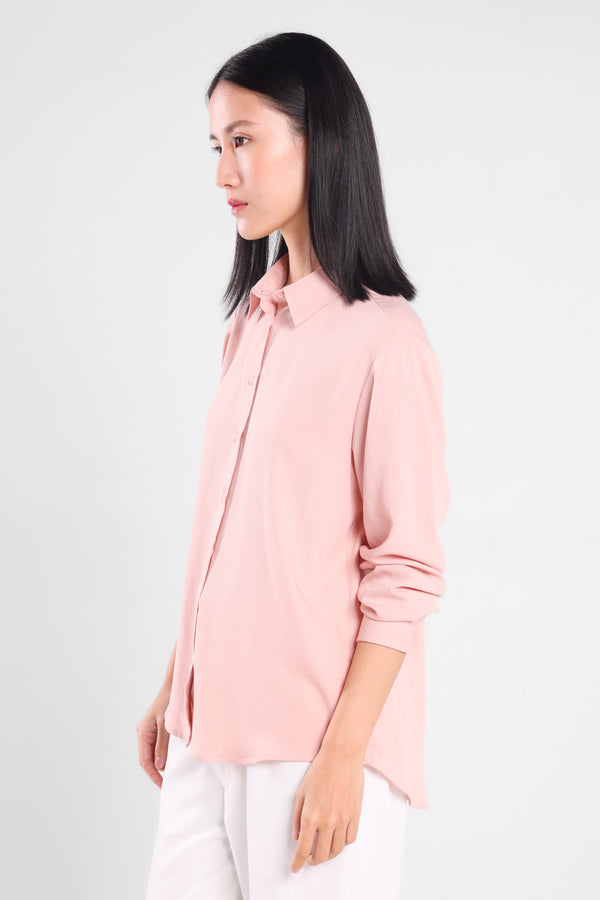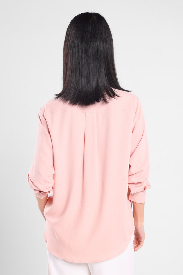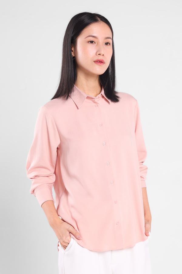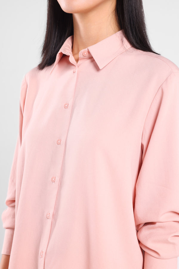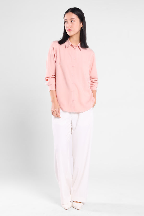 Kemeja lengan panjang dengan desain klasik berkerah dan kancing depan penuh, memberikan tampilan rapi dan elegan.