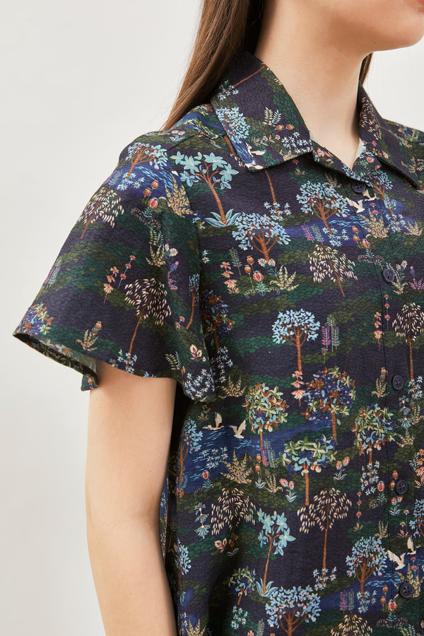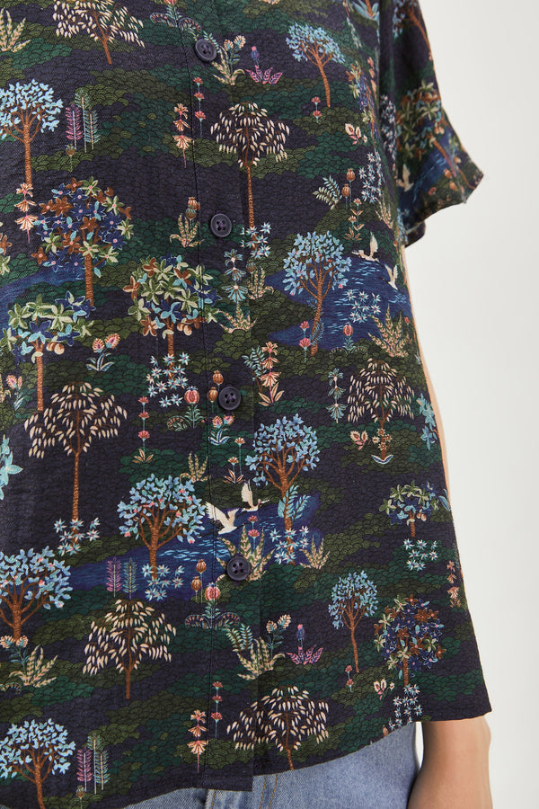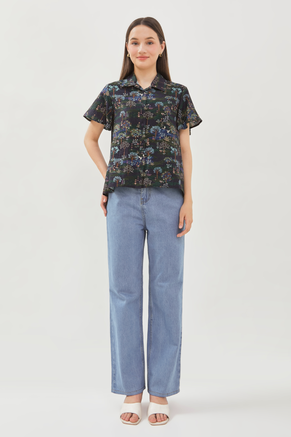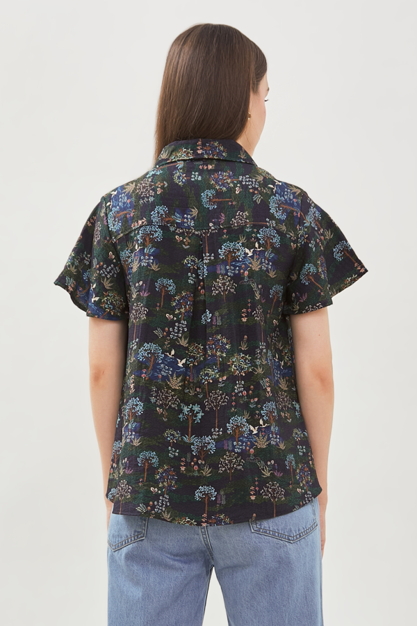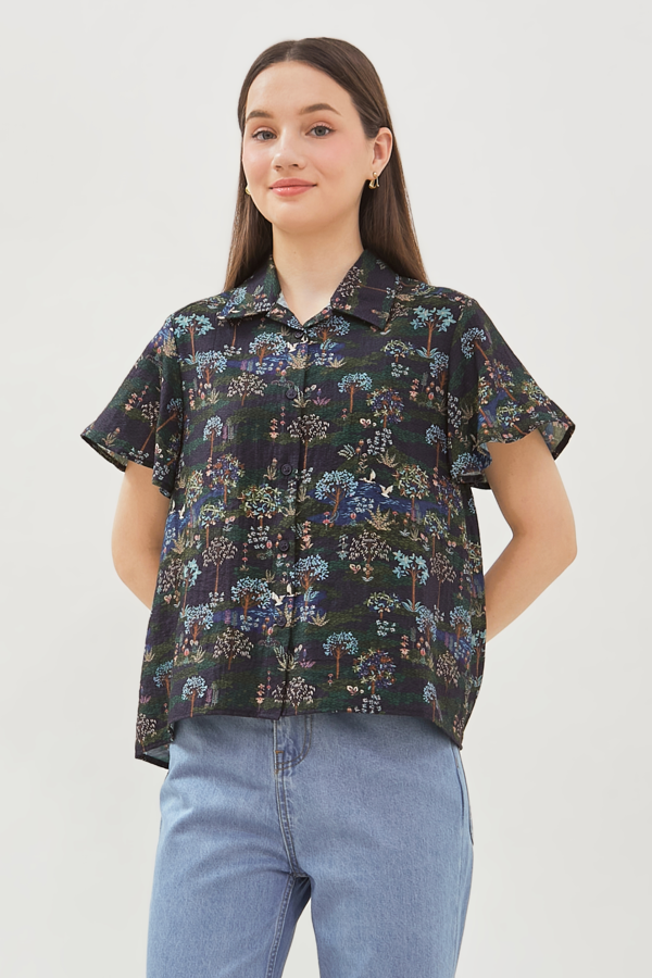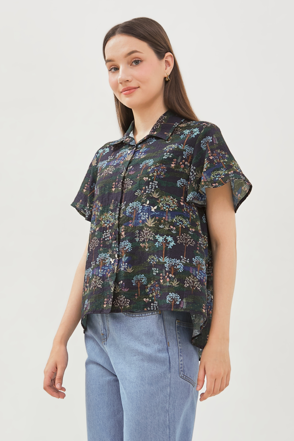 Blus / Kemeja bahan poly rayon bermotif digital print flora dan fauna dengan sentuhan lengan lebar yang cantik.