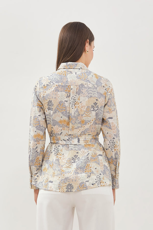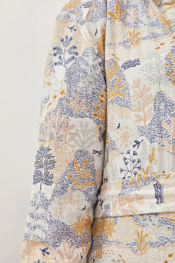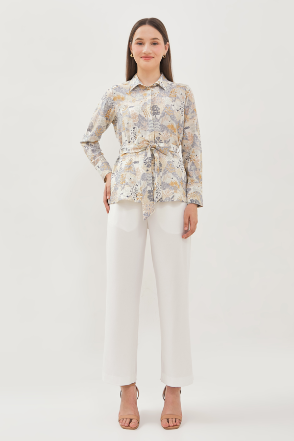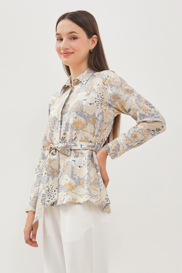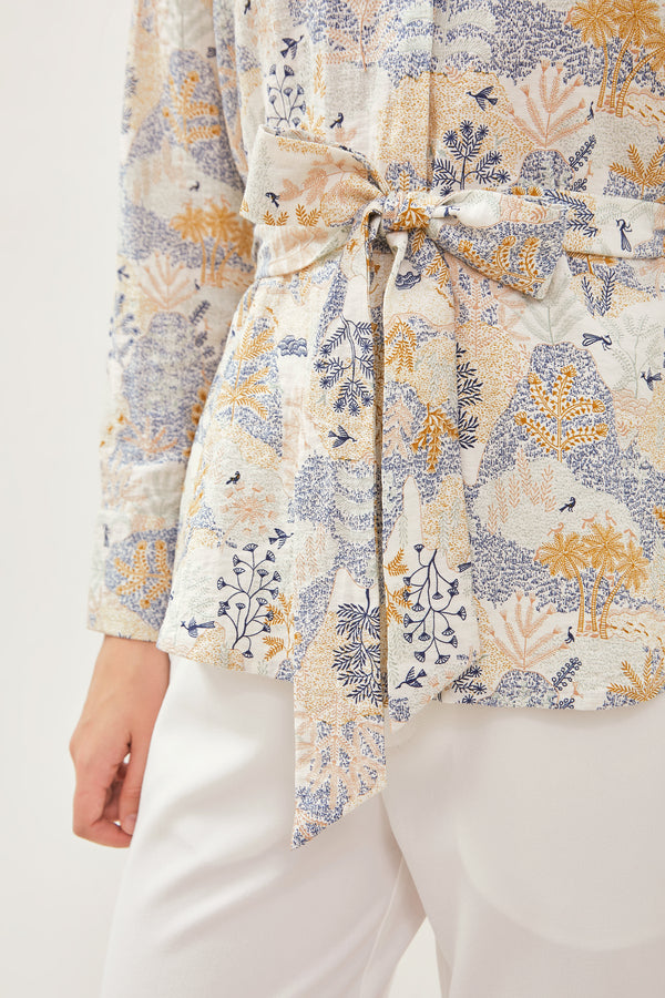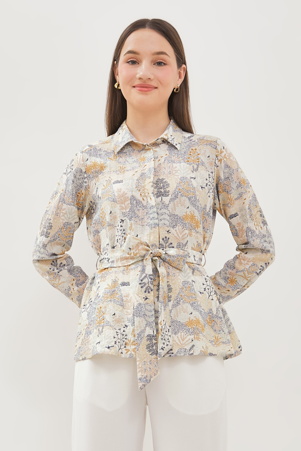 Blus / kemeja bahan poly rayon bermotif digital print flora dan fauna lengan panjang formal dengan detail tali pinggang.