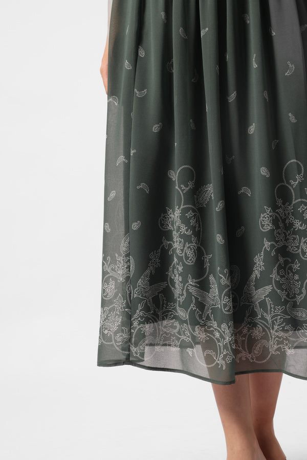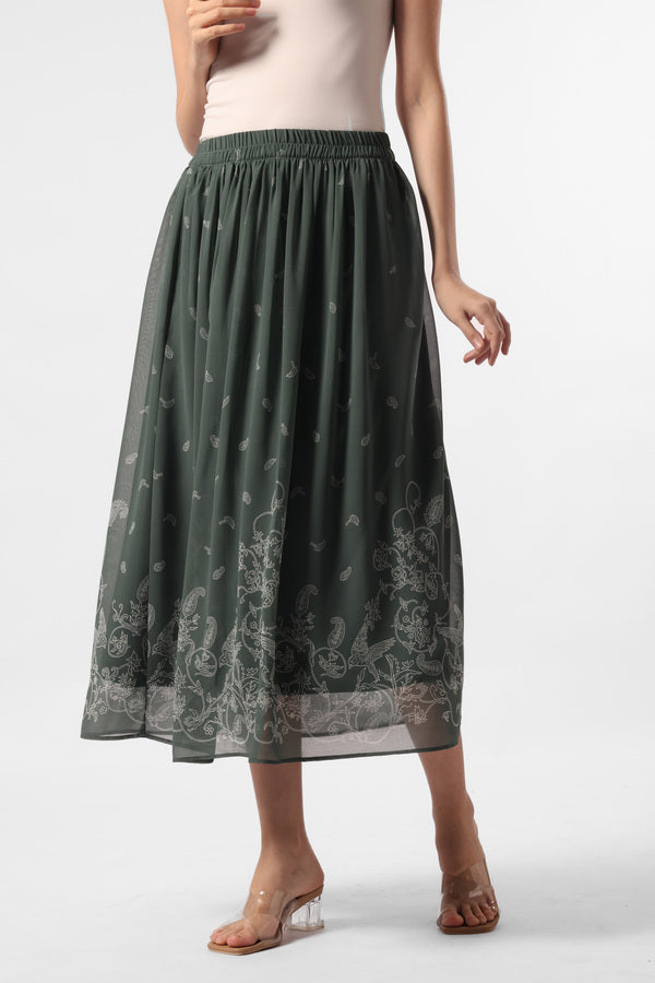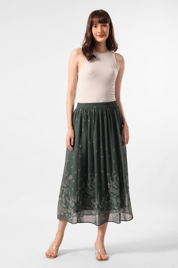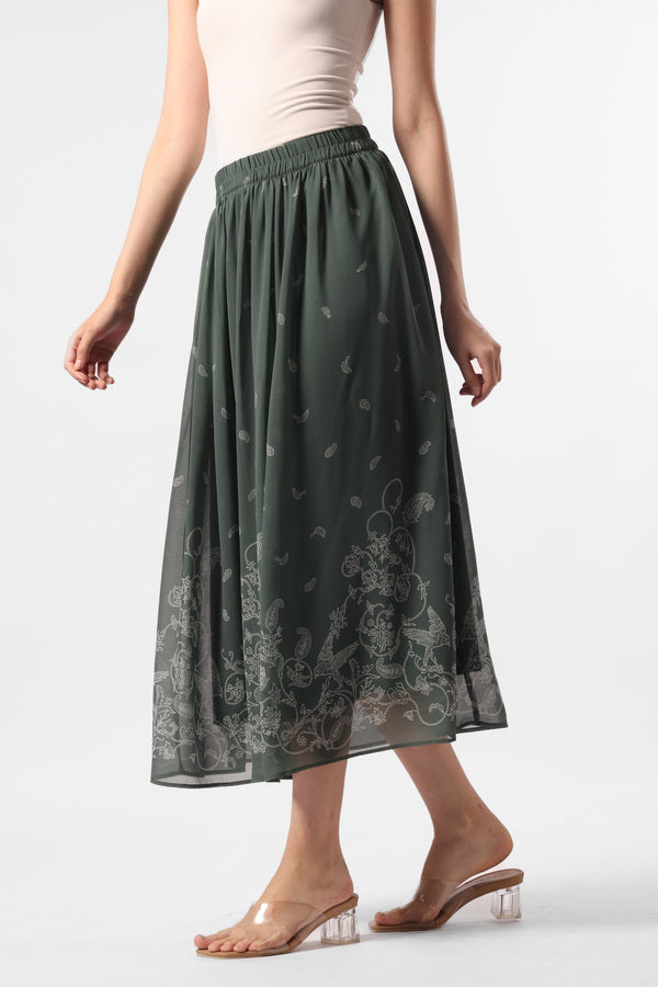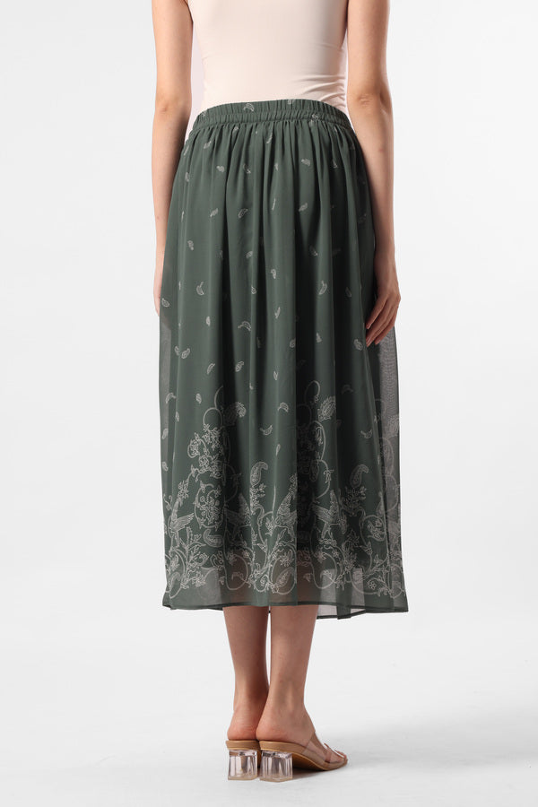 Rok maxi chiffon dengan detail print paisley, dilengkapi dengan lapisan jersey.
