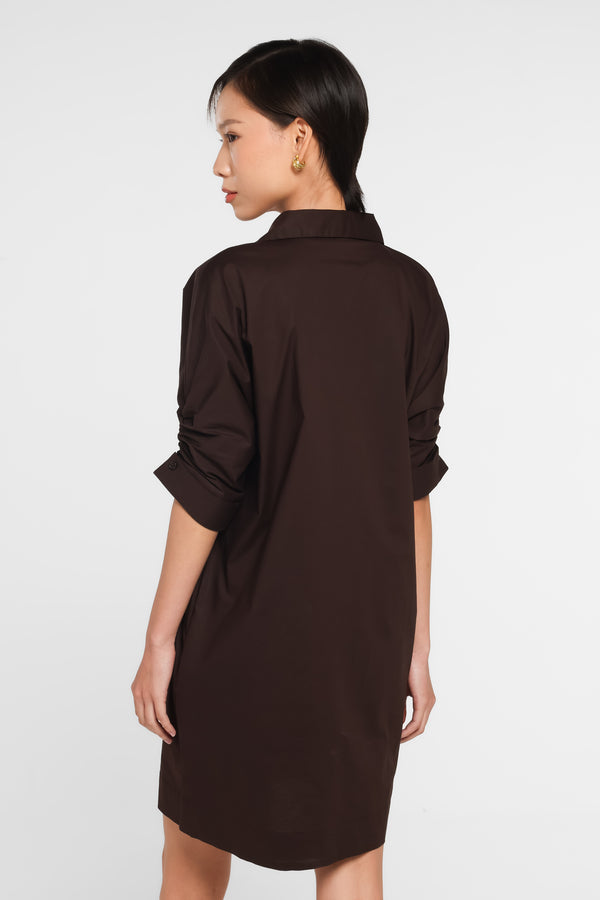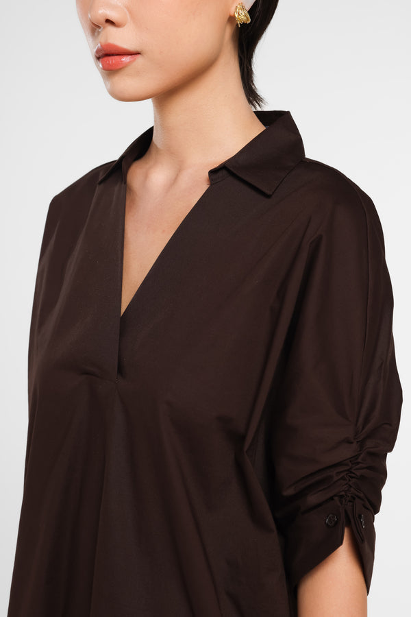 Dress V-Neck lengan setali dengan detail kerut pada bagian manset, dilengkapi dengan kantong pada bagian samping, outfit casual untuk kegiatan sehari-hari.