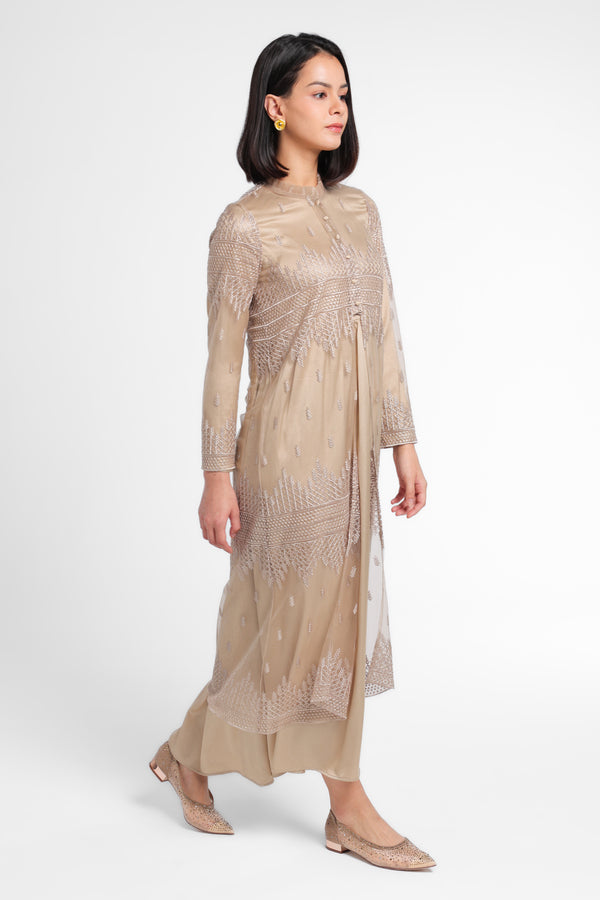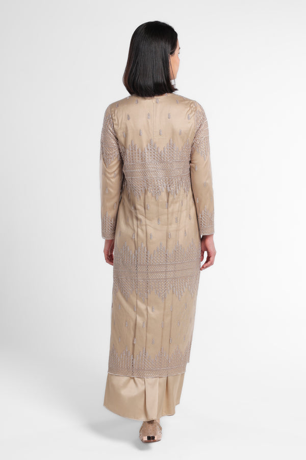 Gaun midi yang dibuat dari bahan brocade motif ornament, bagian luar dibuat seperti outer, lapisan dalam berbahan satin. Dapat dipakai secara terpisah. Garis leher bulat shanghai dengan detail ruffle kecil. Lengan panjang lurus berbahan brocade.