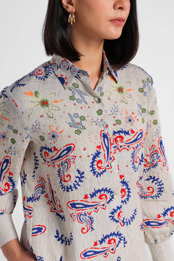 Kemeja dengan Motif Paisley Gradasi yang dirancang dalam komposisi warna Beige,