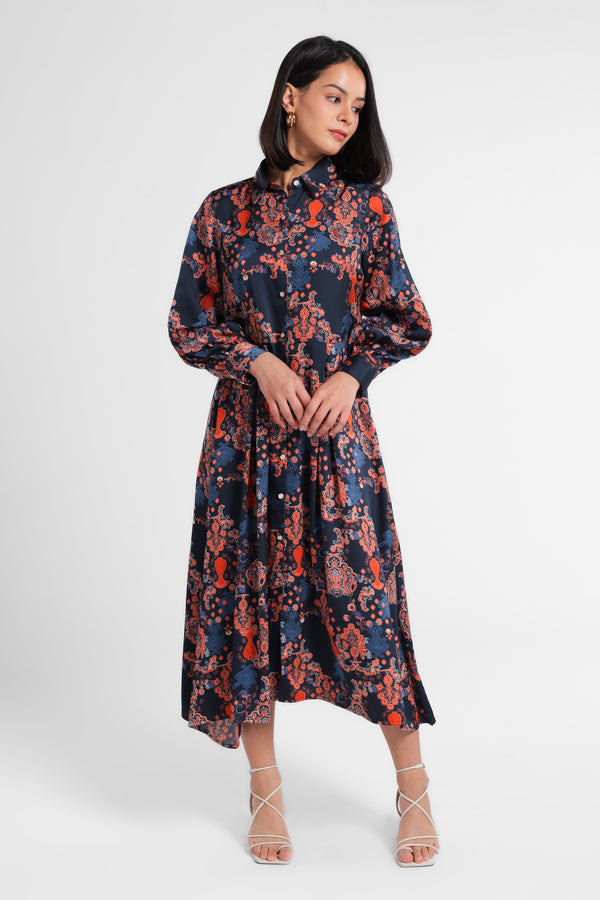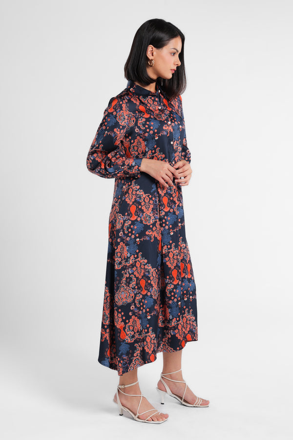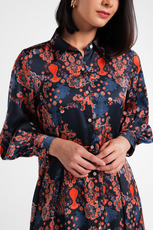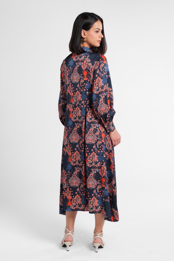 Dress panjang bahan satin polyester yang jatuh dan nyaman dipakai. Dibuat dari motif special pasley dengan warna gelap yang mewah. Dress ini dapat dipakai untuk acara formal Lebaran.