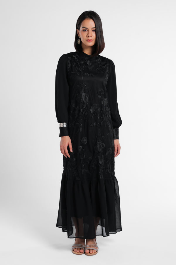 Gaun midi yang dibuat dari bahan brocade motif floral, lapisan dalam berbahan satin. Garis leher bulat shanghai. Lengan panjang berbahan youryu lapisan dalam satin dengan detail ujung manset gathered bahan brocade. Keliman bawah berdetail ruffle berbahan youryu. Terdapat lapisan dalam berbahan satin.
