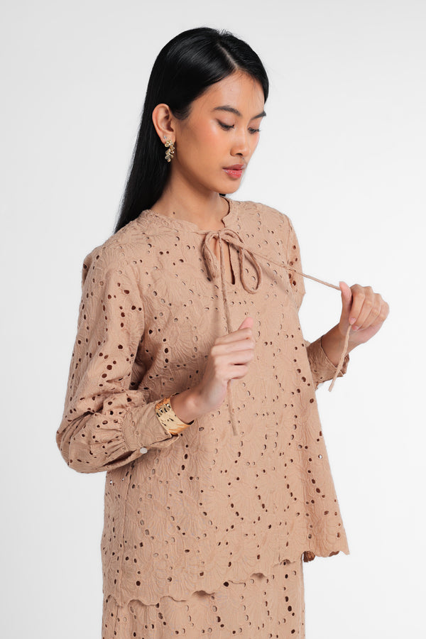 Blouse Cotton Eyelet dirancang dalam komposisi  warna Beige. Menciptakan tampilan Lebaran yang elegan tanpa terasa berlebihan. Potongan clean dan siluet minimal menjaga motif tetap terlihat refined. Mudah dipadukan dengan berbagai bawahan