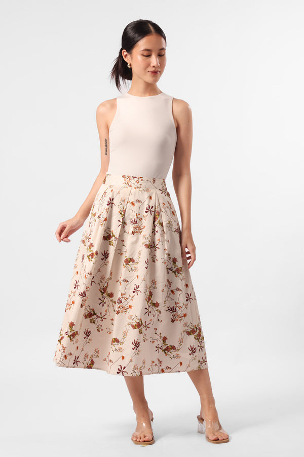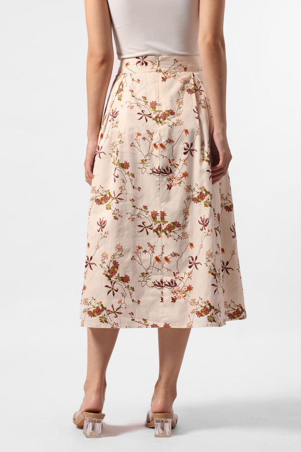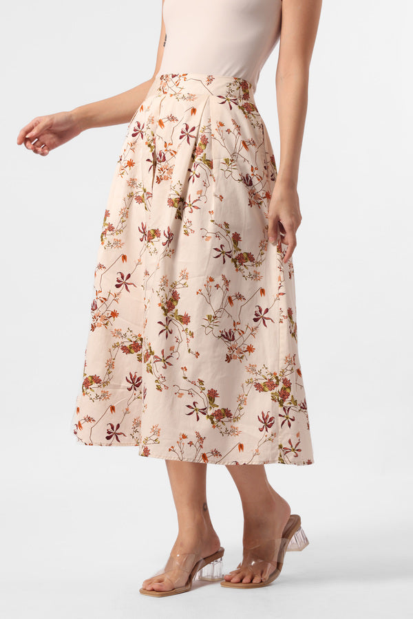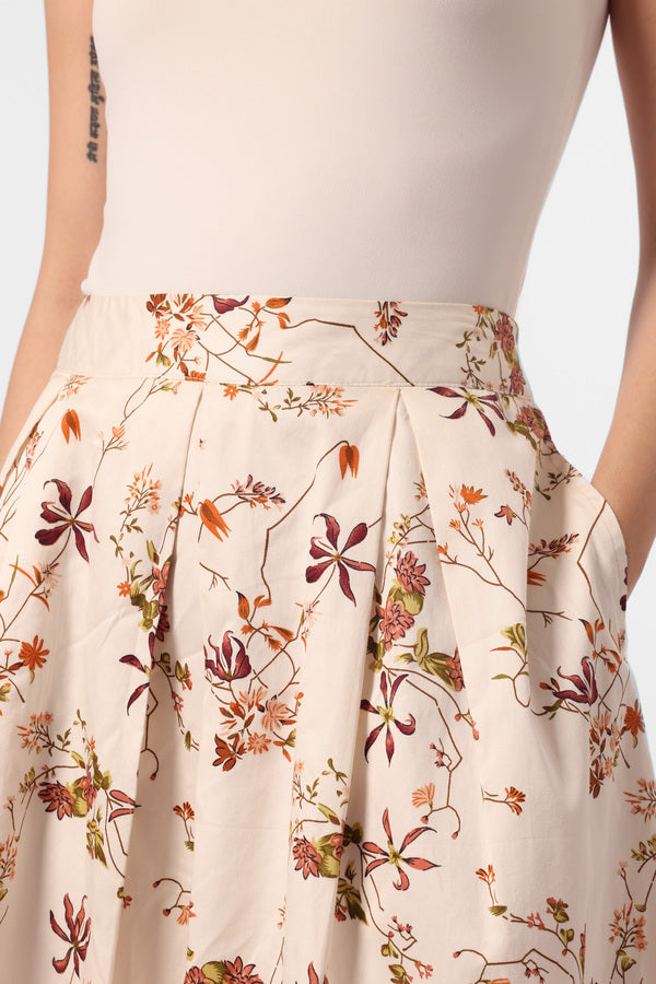 Rok lipit midi berbahan katun dengan motif bunga, dilengkapi dengan lapisan furing.