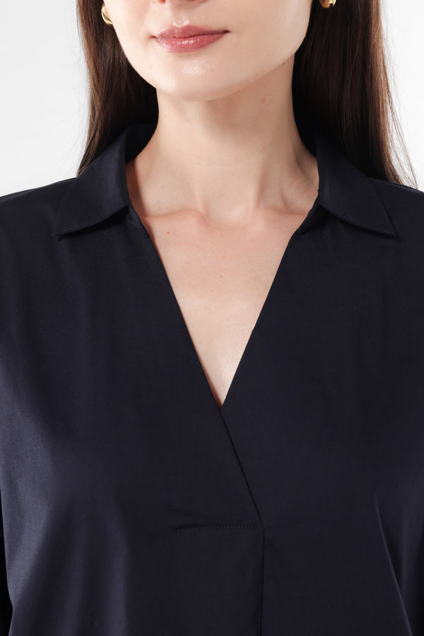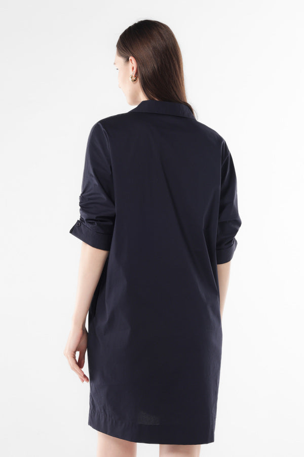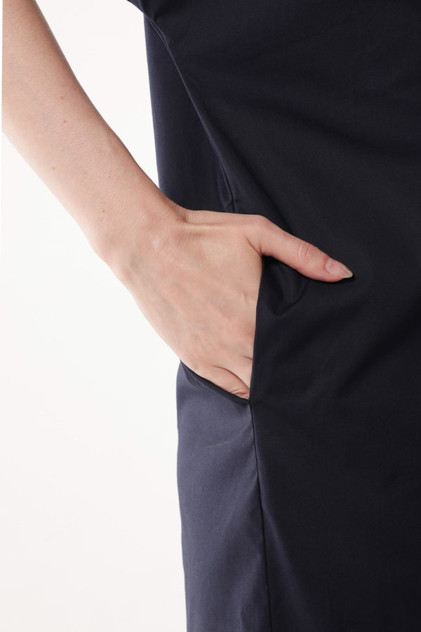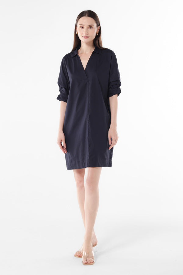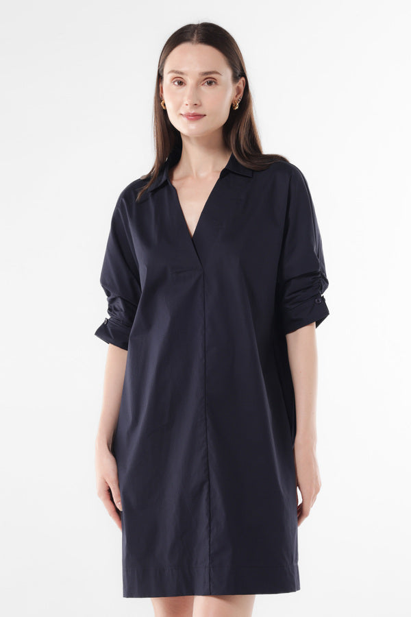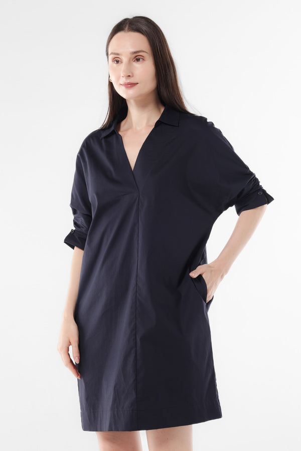 Dress V-Neck lengan setali dengan detail kerut pada bagian manset, dilengkapi dengan kantong pada bagian samping, outfit casual untuk kegiatan sehari-hari.